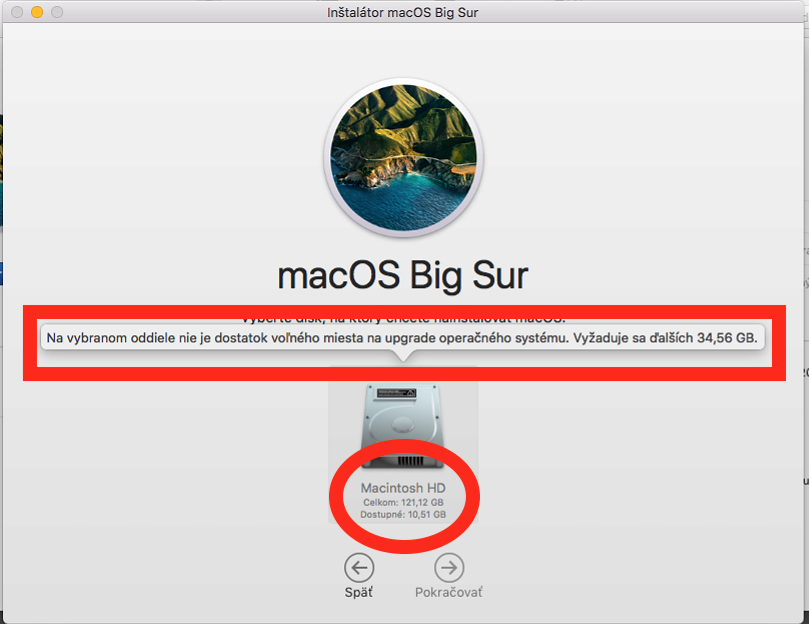 V prípade, že máte na disku nedostatok miesta, inštalátor vás nepustí ďalej. Prečítajte si návod ako uvoľniť voľné miesto.