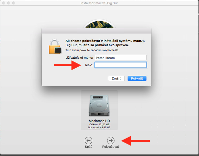 Ak máte dostatok voľného miesta, kliknite na Pokračovať a napíšte heslo, s ktorým sa prihlasujete do počítača.