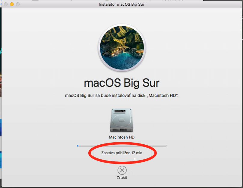 Po reštartovaní uvidíte jabĺčko na čiernej obrazovke a inštalácia pokračuje ešte asi 30 minút.