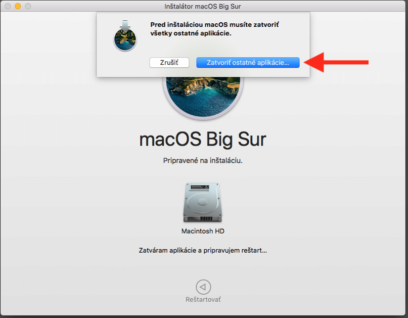 Ďalej sa počítač bude reštartovať. Je treba zavrieť všetky otvorené aplikácie. Buď ručne, alebo kliknutím na tlačidlo.