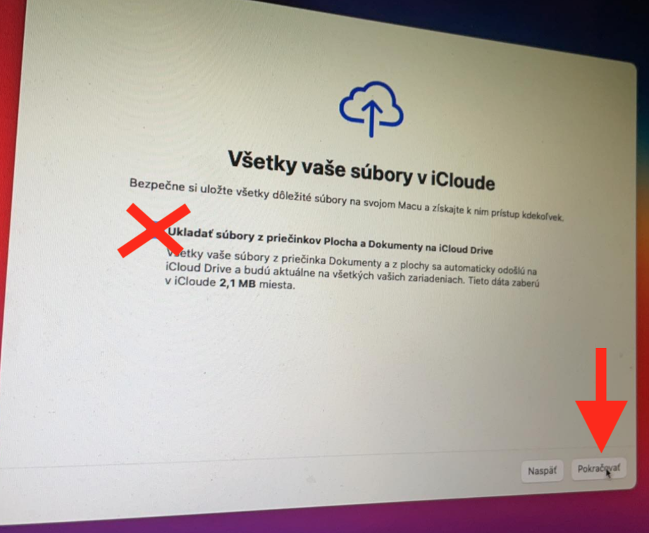 Po nainštalovaní sa vás počítač opýta, či ukladať súbory v iCloude. To nechceme. Preto nenechávajte zaškrtnuté políčko. A kliknite na Pokračovať.