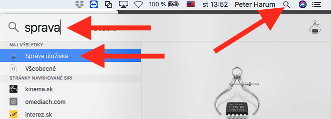 Otvorte si aplikáciu Správa úložiska, ktorá vám pomôže vyhľadať nepotrebné súbory v počítači. Aplikáciu nájdete kliknutím na lupu. Napíšte Správa a kliknite na „Správa úložiska“