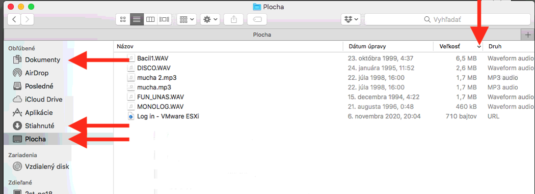 Otvorte Finder a prepnite sa na súbory na ploche. Nastavte si usporiadanie podľa veľkosti a zmažte nepotrebné súbory.