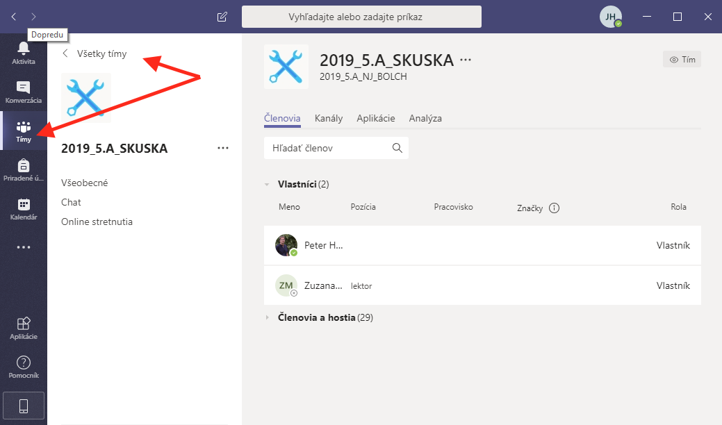 Tímom sa rozumie akákoľvek skupina, ktorá spolu potrebuje pracovať. To znamená, že každý učiteľ ma na každý predmet s každou triedou samostatný tím. Kliknutím na ikonku Tímy a všetky tímy sa automaticky zobrazia tímy, do ktorých vás učitelia pridelili. Vyberte si tím, v ktorom budete mať online hodinu.