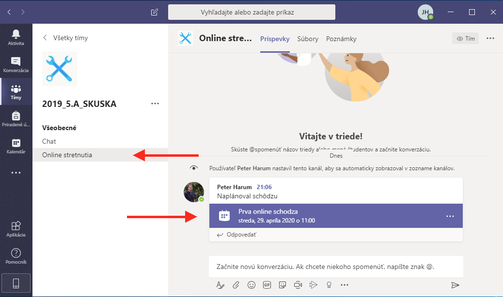 V každom tíme je niekoľko kanálov. Každý slúži na komunikáciu. Online hodiny budete mať pravdepodobne v kanáli Online stretnutia. Kliknite na tento kanál. Ak je naplánována hodina, ktorá ešte neprebieha, uvidíte dátum a čas, kedy sa online hodina začne. Ak má hodina začať každú chvíľu, môžte sa do nej pripojiť aj pred začiatkom. Kliknite na naplánovanú hodinu.