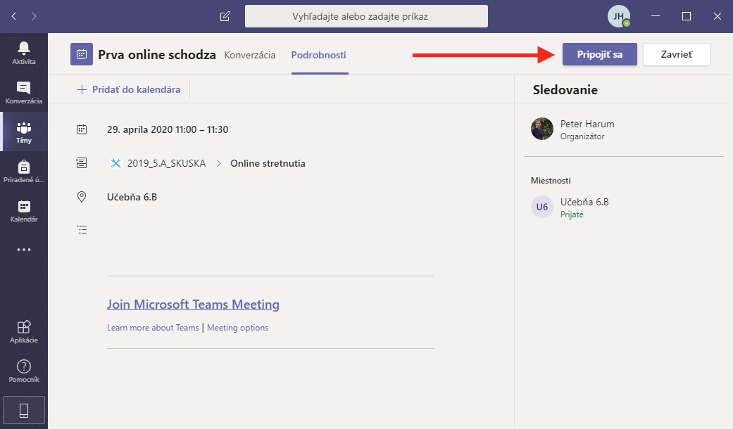 Ak hodina práve prebieha, uvíte ikonku kamery a čas, ako dlho hodina beží. Jednoducho kliknite na Pripojiť sa.