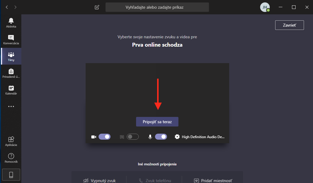 Zobrazí sa okno, kde si môžte skontrolovať obraz a zvuk a ak je všetko správne, kliknite na Pripojiť sa teraz.
