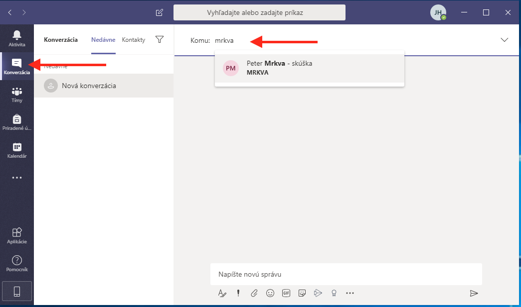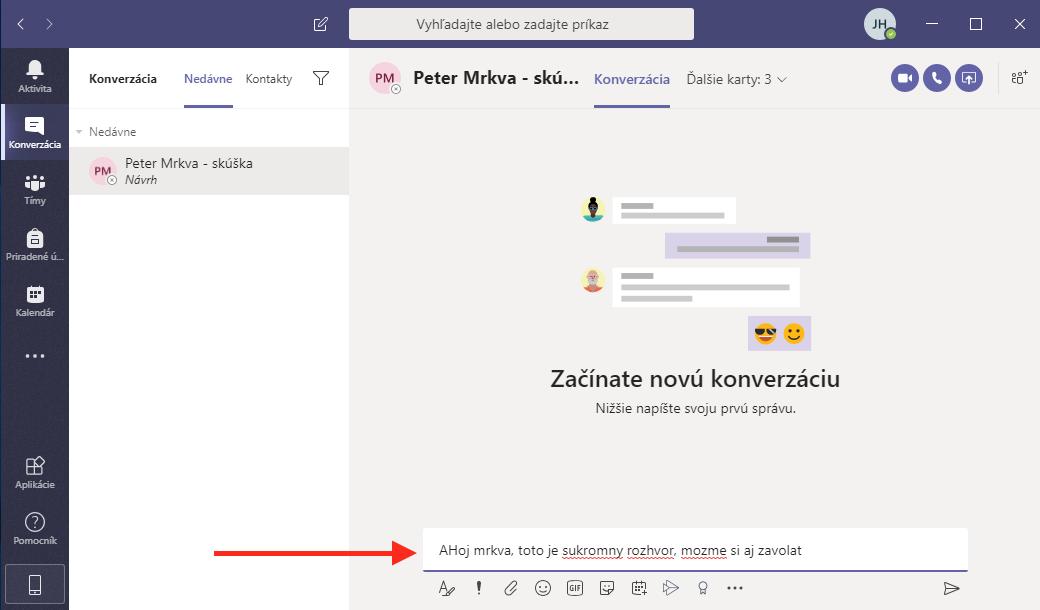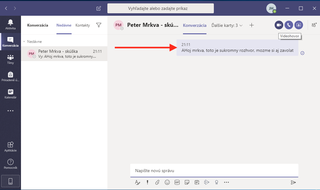 Ak chete napísať žiakovi, alebo učiteľovi súkromnú správu, prepnite sa do záložky Konverzácia. Potom začnite písať meno toho, komu chete napísať súkromnú správu. Následne mu môžete aj zavolať kliknutím na telefónik v pravom hornom rohu a mať s ním súkromný video hovor.