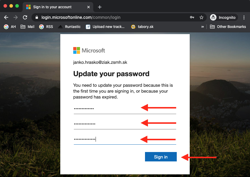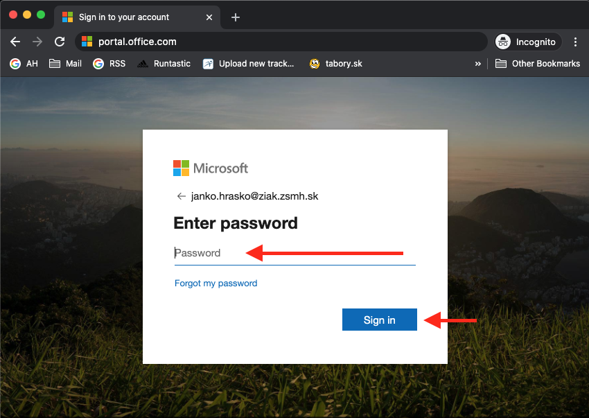 Ak Vám nebude heslo fungovať, pravdepodobne je to preto, lebo zadávate nesprávne veľké a malé písmená. Ak nebude fungovať aj napriek tomu a ste si istí, že ste sa ešte do Office neprihlasovali, napíšte správcovi na email admin@zsmh.sk, opíšte postup, ktorý ste skúšali a on to skontroluje a odstráni chybu.