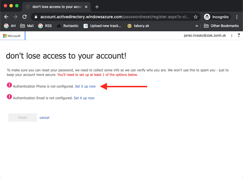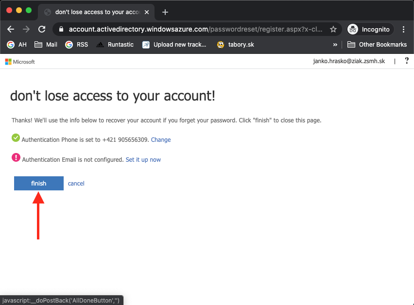Ak to dobre dopadlo, máte zelenú fajku a môžte kliknúť na Finish. Je síce možné ešte nastaviť alternatívny email, ale ten nie je povinný.