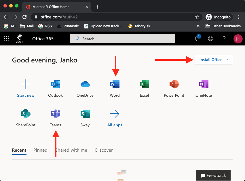 Prihlásili ste sa do prostredia Office365 odkiaľ môžete spúšťať online aplikácie ako Word, alebo Teams, prípadne si stiahnuť aplikácie do počítača a nainštalovať ako riadne programy.