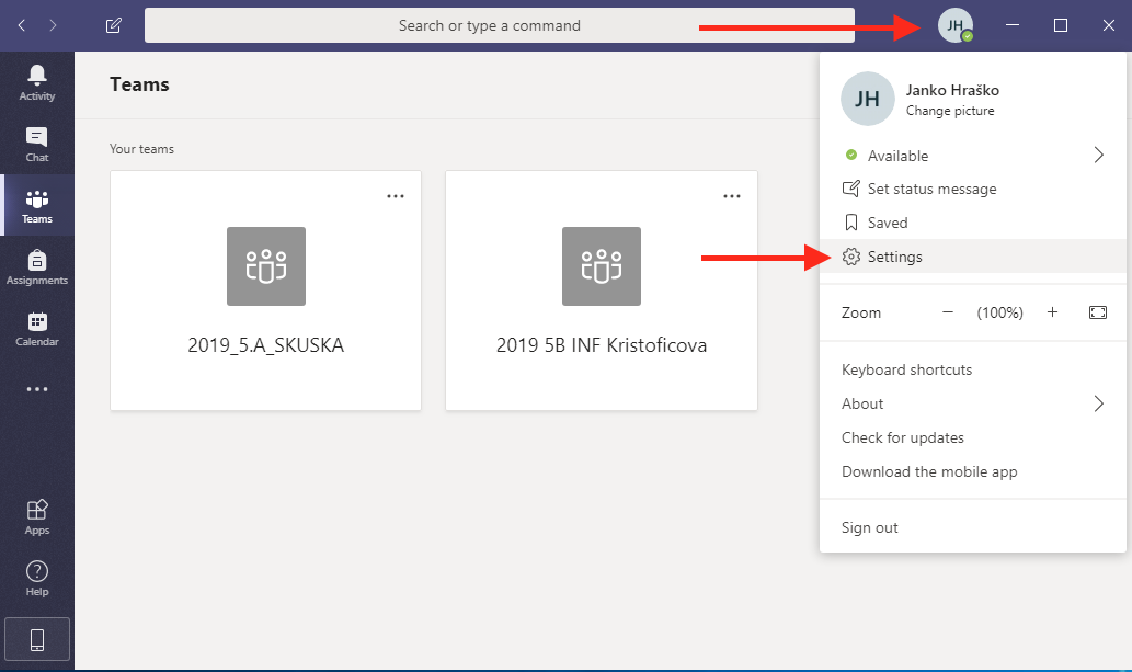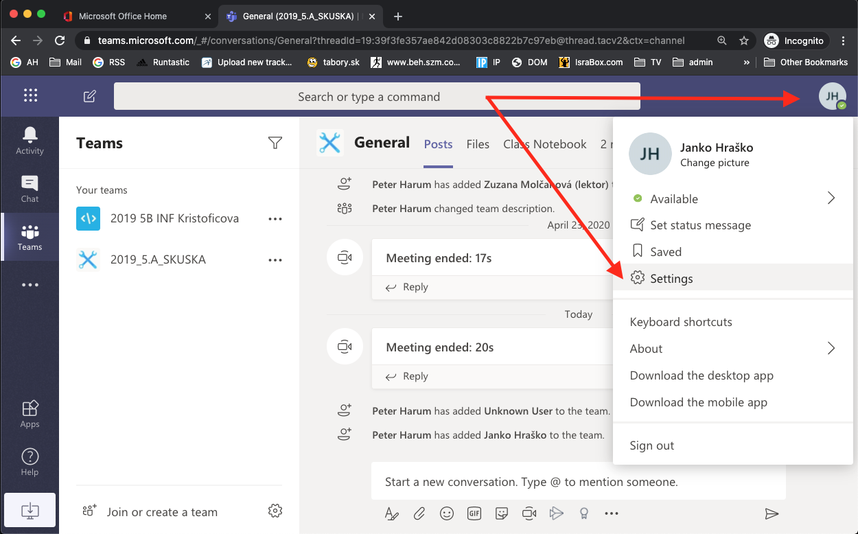 Hotovo. Ak ste sa prvýkrát prihlásili, je vhodné zmeniť jazyk programu na slovenčinu. Kliknite na vašu ikonku vpravo hore a potom na Settings. Potom zmeňte Language z English na Slovenčina.