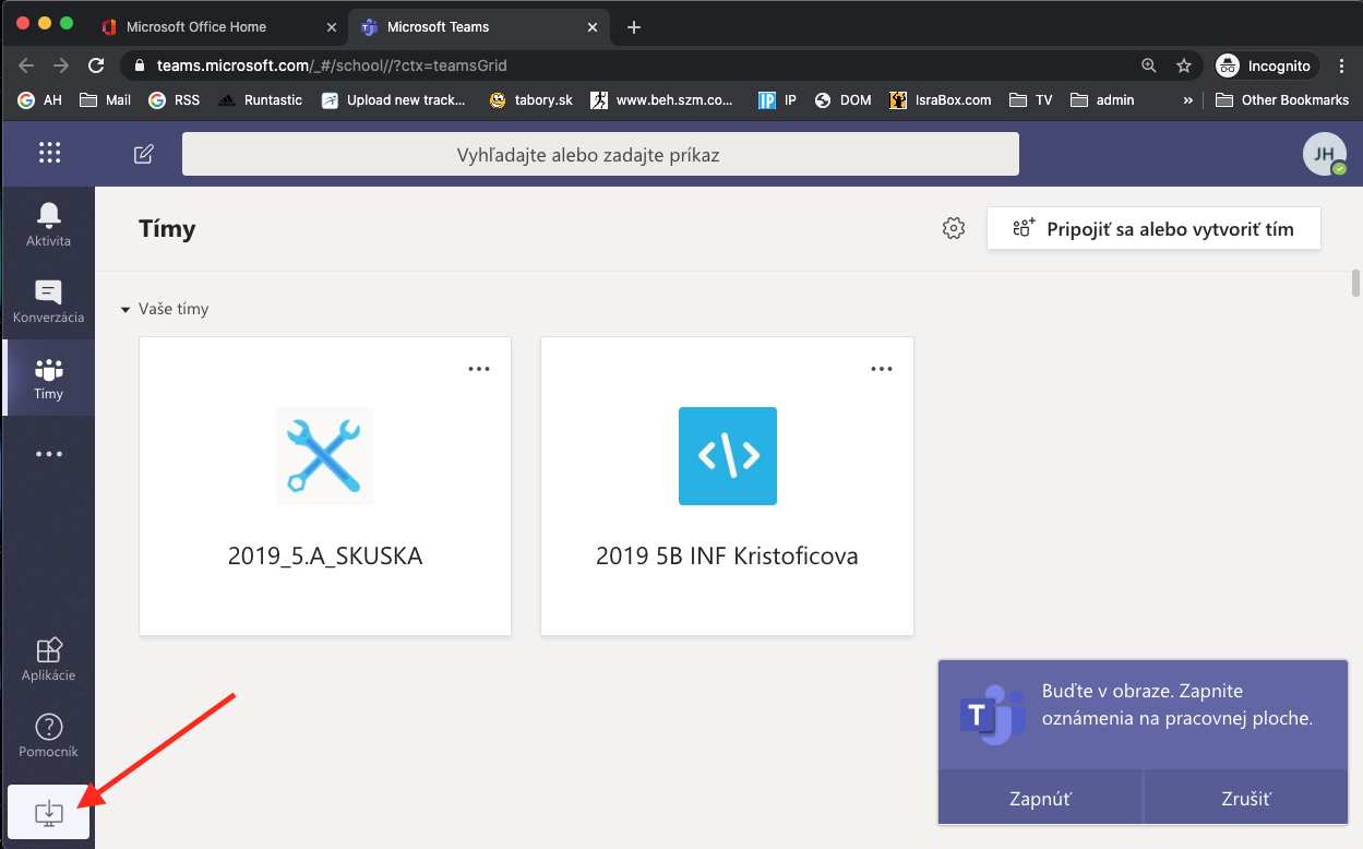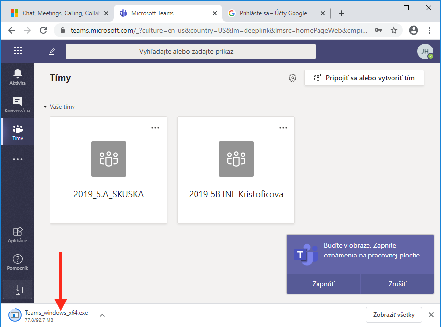Toto je len online verzia Teams, ale my si chceme stiahnuť Teams do počítača a nainštalovať si ho ako program. Je to oveľa lepšie a najmä sa netreba stále prihlasovať. Kliknutím na ikonku vľavo dole si stiahnete Teams do počítača a môžete ho nainštalovať.