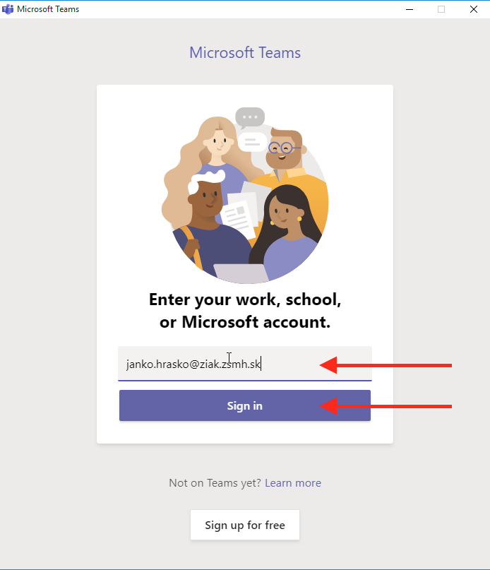 Po nainštalovaní a prvom spustení programu Teams sa musíte opäť prihlásiť. Neskôr už od vás prihlásenie nebude pýtať. Zadajte svoje meno pre Office 365, ktoré vyzerá ako školský email.