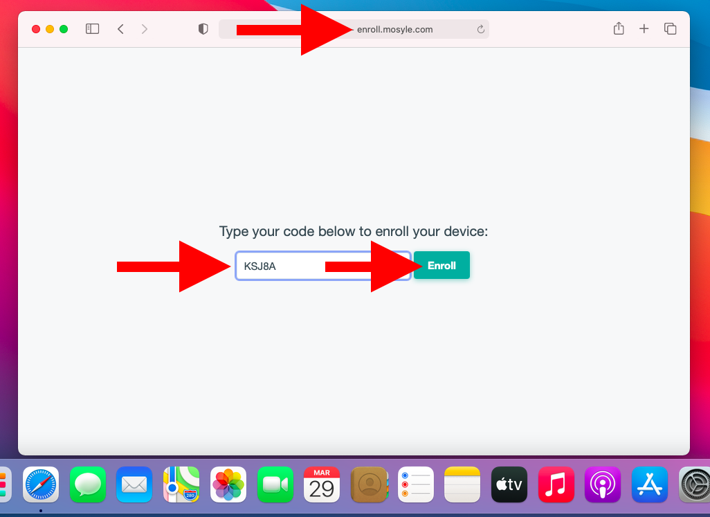 Prostredníctvom prehliadača Safari otvorte stránku enroll.mosyle.com, zadajte registračný kód, ktorý vám dal správca a kliknite na Enroll