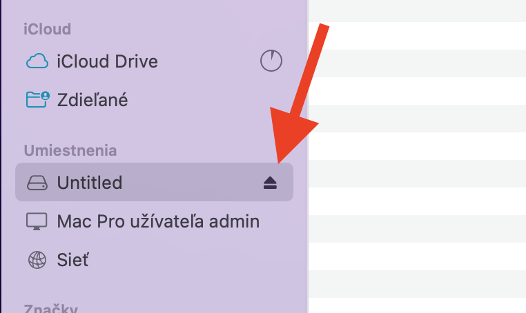Ak vytiahnete kľúč počas toho, ako počítač zapisuje dáta na kľuč, môže sa vám stať, že o dáta na kľúči prídete. Predtým ako kľúč vytiahnete, je potrebné zatvoriť všetky programy, ktoré kľúč používajú (Word, Powerpoint, otvorená fotka atď..). Následne cez FINDER v sekcii Umiestnenia kliknite na malú ikonku odpojenia.