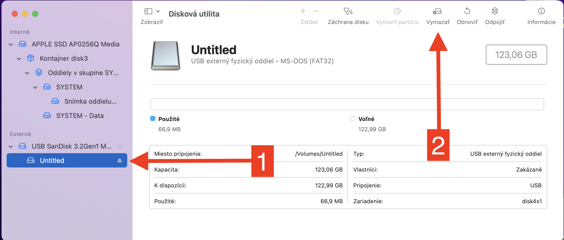 V často Externé vyberte oddiel USB kľúča a kliknite na Vymazať