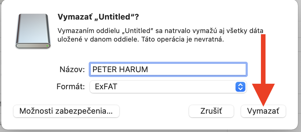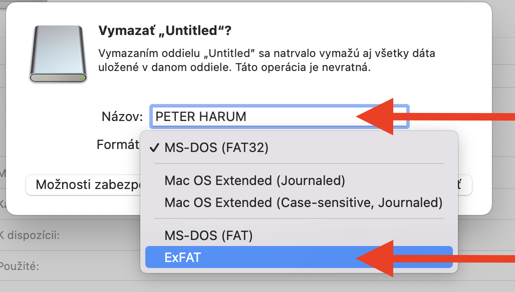 Vyberte ExFAT a zvoľte názov usb kľúča – ideálne Vaše meno.