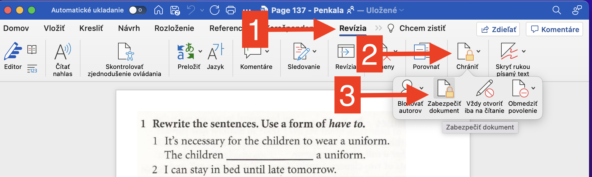 Kliknite na na záložku Revízia, ikonku Chrániť a zvoľte Zabezpečiť dokument