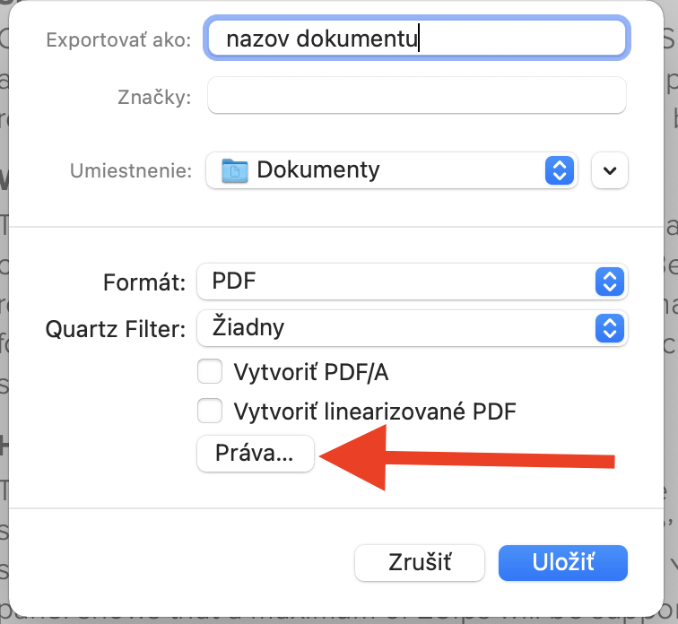 Zadajte názov nového zaheslovaného súboru PDF a kliknite na Práva.