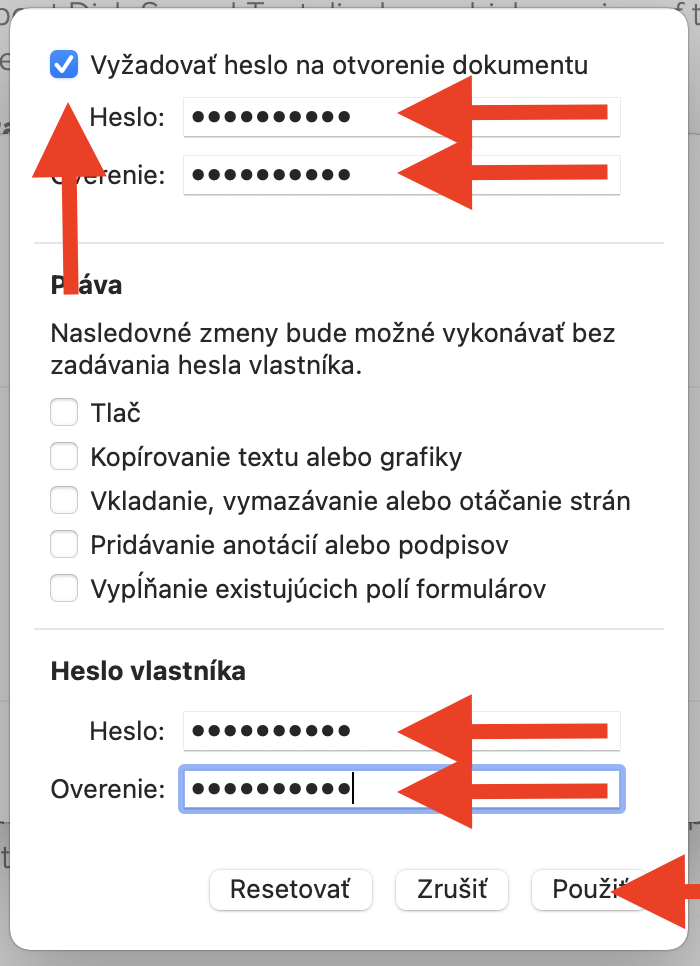 Zaškrtnite „Vyžadovať heslo“ a zvoľte heslo pre otvorenie dokumentu a potom heslo pre vlastníka dokumentu (môže byť to isté). Kliknite na Použiť.