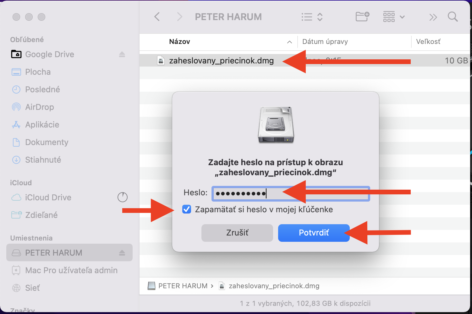 Teraz na vašom USB kľúči pribudol súbor .dmg. Toto je ten zaheslovaný priečinok – resp. obraz. Keď na neho 2x kliknete, stačí zadať heslo. Môžete zaškrtnúť zapamätanie hesla v kľúčenke vďaka čomu to heslo na tomto počítači nebudete už musieť vypisovať. Ak heslo stratíte, alebo zabudnete, priečnok neotvoríte.