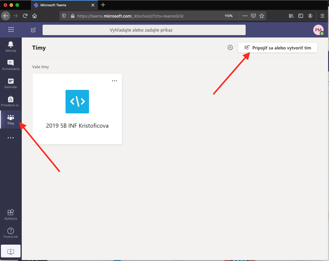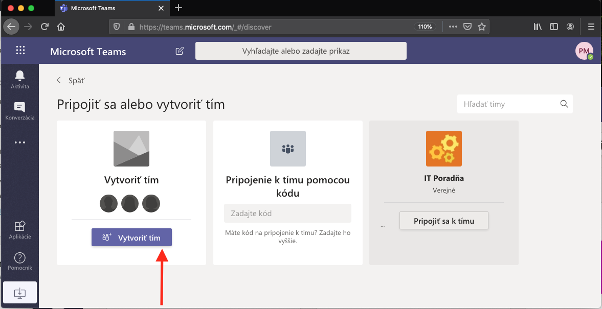Kliknite na ikonku Tímy a potom na Pripojiť sa alebo vytvoriť tím.