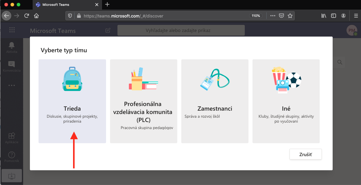 A ďalej kliknite na Vytvoriť tím. A v ďalšom okne na Trieda.