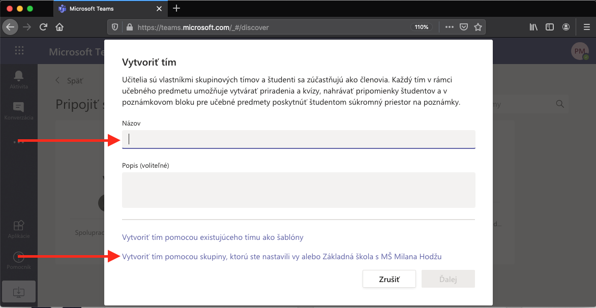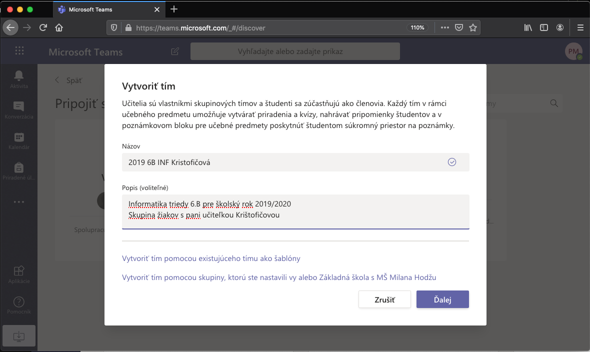 Do popisu jasne napíšte o aký tím ide, aby žiaci popisu rozumeli. Potom klinite na Ďalej.