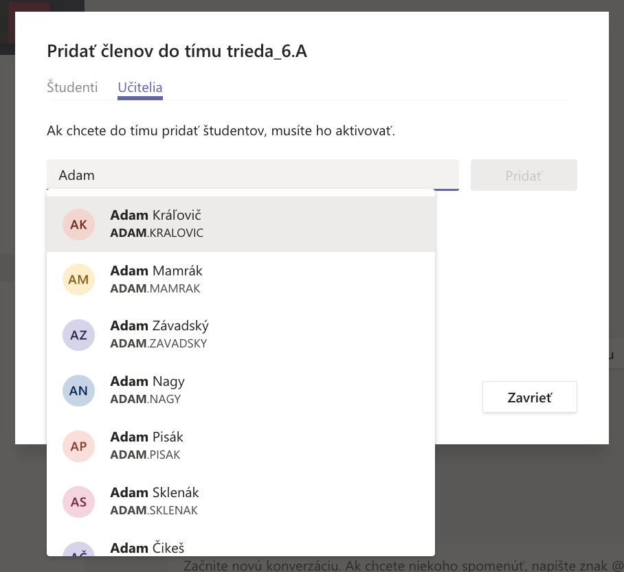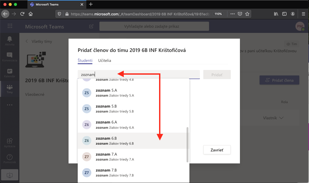 Ak chcete adať hromadne žiakov celej triedy, začnite písať slovo zoznam. Automaticky vám vybehnú zoznamy žiakov tried a vy si len vyberiete triedu, ktorú chete pridať. Ak chcete pridať 2 triedy, môžete znovu napísať zoznam a vybarať ďalšiu triedu.