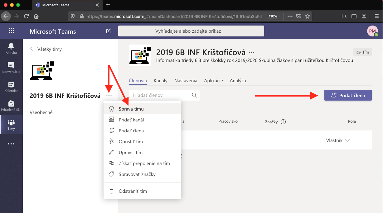 V tomto návode si ukážeme postup pri vytváraní tímu. Tímom sa rozumie akákoľvek skupina, ktorá spolu potrebuje pracovať. Napríklad učiteľ učiaci matematiku v 6.B si vytvorí pre túto výučbu samostatnú skupinu. Pre matematiku v 6.A si vytvorí samostatnú skupinu pre 6.A. V prípade, že preberá úplne rovnaké učivo v oboch triedach a zadáva tie isté úlohy, môže si skupinu spojiť. Učitelia, ktorí učia spojené hodiny si vytvoria také skupiny žiakov s ktorými preberá to isté učivo a zadáva tie isté domáce úlohy, ktoré sa súčasne odovzdávajú.