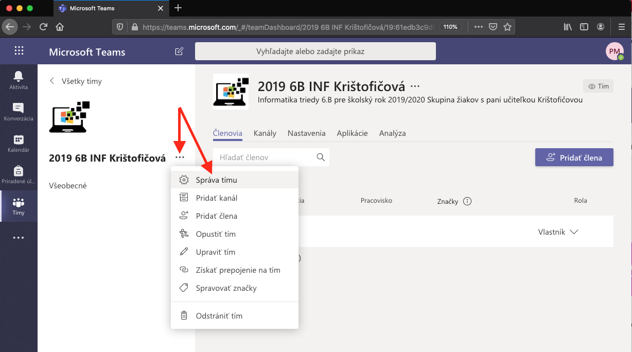 Následne musíte prednastavený tím aktivovať, aby bolo možné upravovať žiakov v tíme. Tých ale pridáme až na konci, keď si nastavíme všetky veci v tíme..