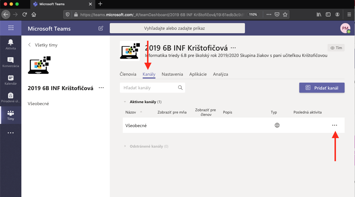 Kliknite na bodky vedľa tímu a zvoľte správa tímu. Potom sa prepnite na kanály. Následne kliknite na bodky pri kanáli Všeobecné.