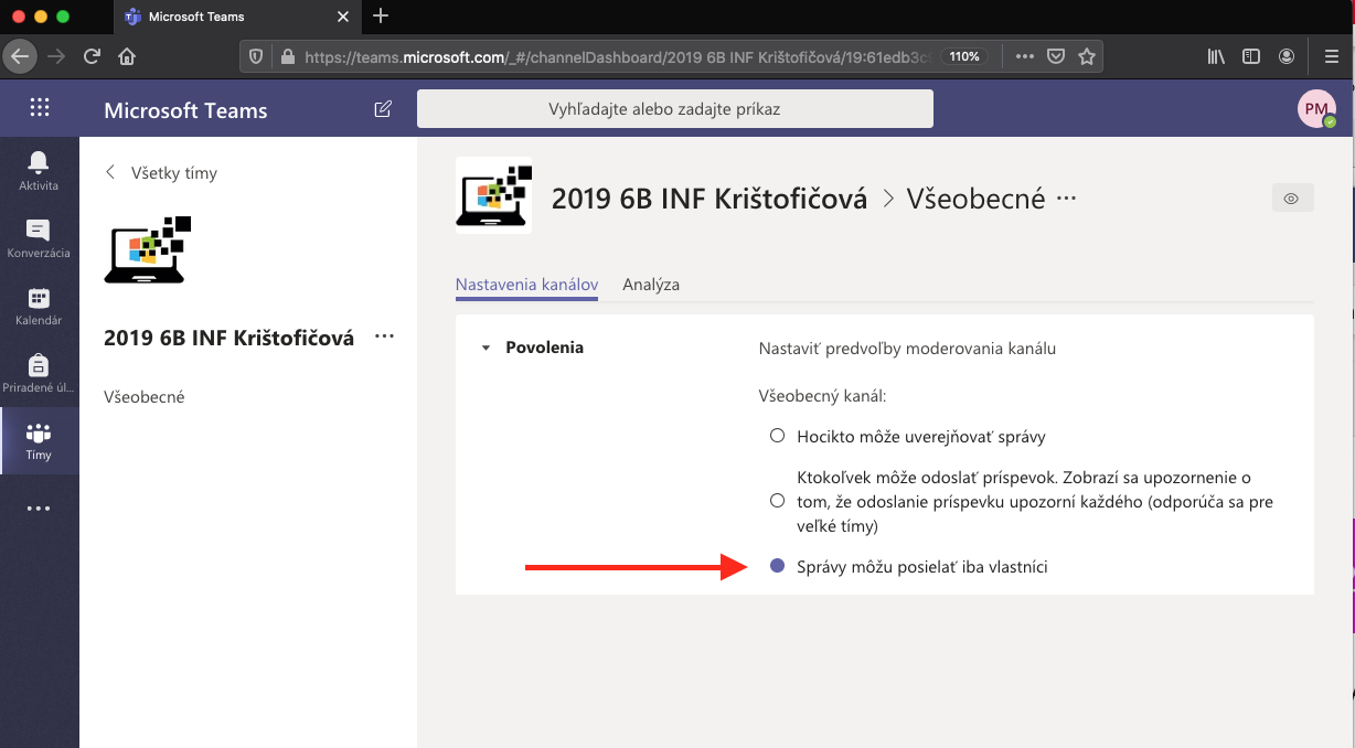 Kanál všeobecný nastavte tak, aby do neho mohli prispievať len vlastníci tímu (teda učitelia). Dávajte do neho len oznamy pre triedu, ktoré sa netýkajú iných činností.