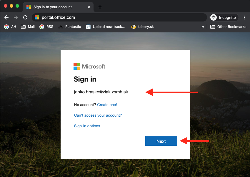 Otvorte si stránku portal.office.com a napíšte vaše prihlasovacie meno a klinite na Next.