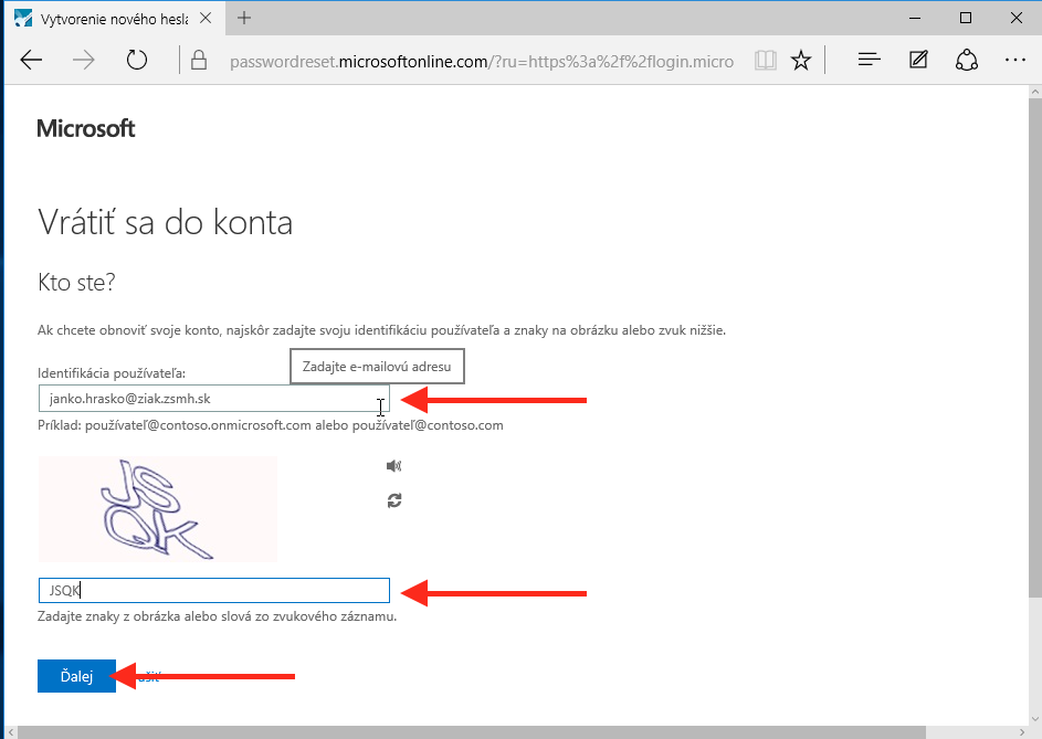 V prvom poli napíšte vaše prihlasovacie meno a dole opíšte kód z obrázku. Ak je kód nečitateľný, kliknite na ikonku šípok do kruhu. Potom kliknite na Ďalej.