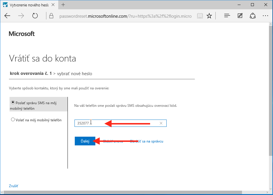 Ak zabudnete heslo do Office 365, môžete si nechať jednoducho poslať overovací kód na váš mobilný telefón. Tento mobilný telefón ste si nastavovali pri prvom prihlásení sa do Office 365. Ak ste sa ešte neprihlasovali do Office 365, pozrite si návod Prvé prihlásenie do Office 365.