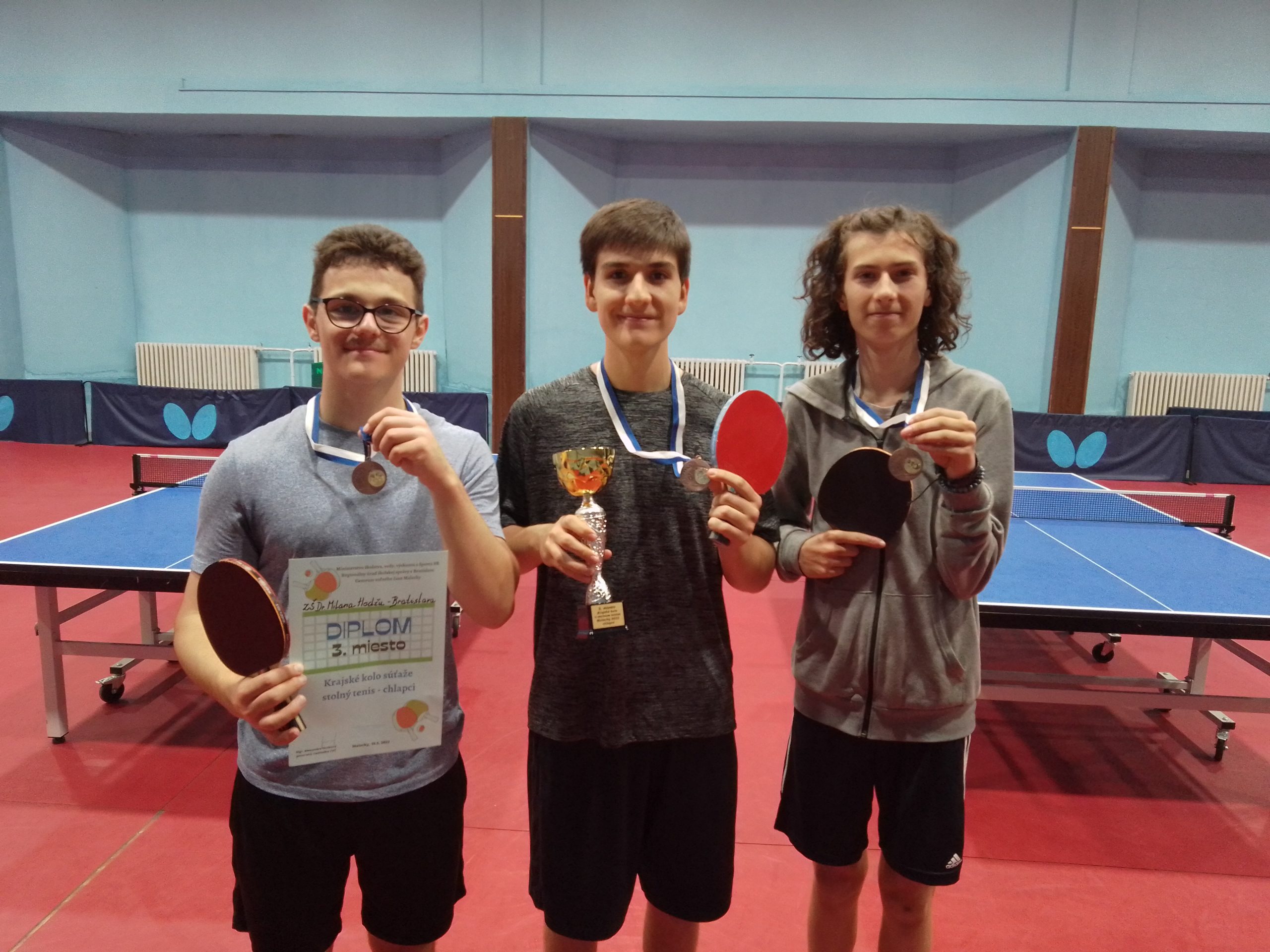 Ako víťaz okresného kola sa naše družstvo v zložení Christian Ayach, Tomáš Mozola a Oskar Smik (všetci 9.B) dnes zúčastnilo na krajskom kole v stolnom tenise, ktoré sa uskutočnilo v Malackách. Chlapcom sa podarilo zopakovať vynikajúci úspech z predchádzajúcich dvoch rokov, keď v silnej konkurencii siedmich družstiev obsadili výborné 3. miesto.