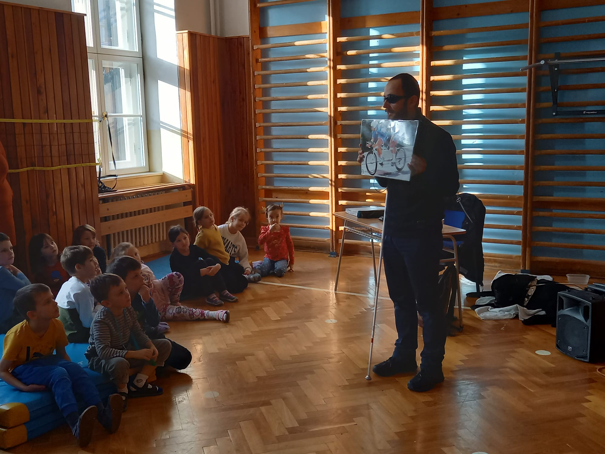 Deti na 1. stupni navštívil nevidiaci pán Juraj Páger aj so svojim psíkom Lukym, ktorý, ako pán Práger povedal, je jeho očami. Vysvetlil deťom základné pojmy, ukázal im rôzne kompenzačné pomôcky, ktoré uľahčujú nevidiacim a slabozrakým život. Deti si vyskúšali orientovať sa bez pomoci zraku a naučili sa, ako sa majú správať k nevidiacim ľuďom. Najviac ich zaujala ukážka práce s vodiacim psíkom Lukym.