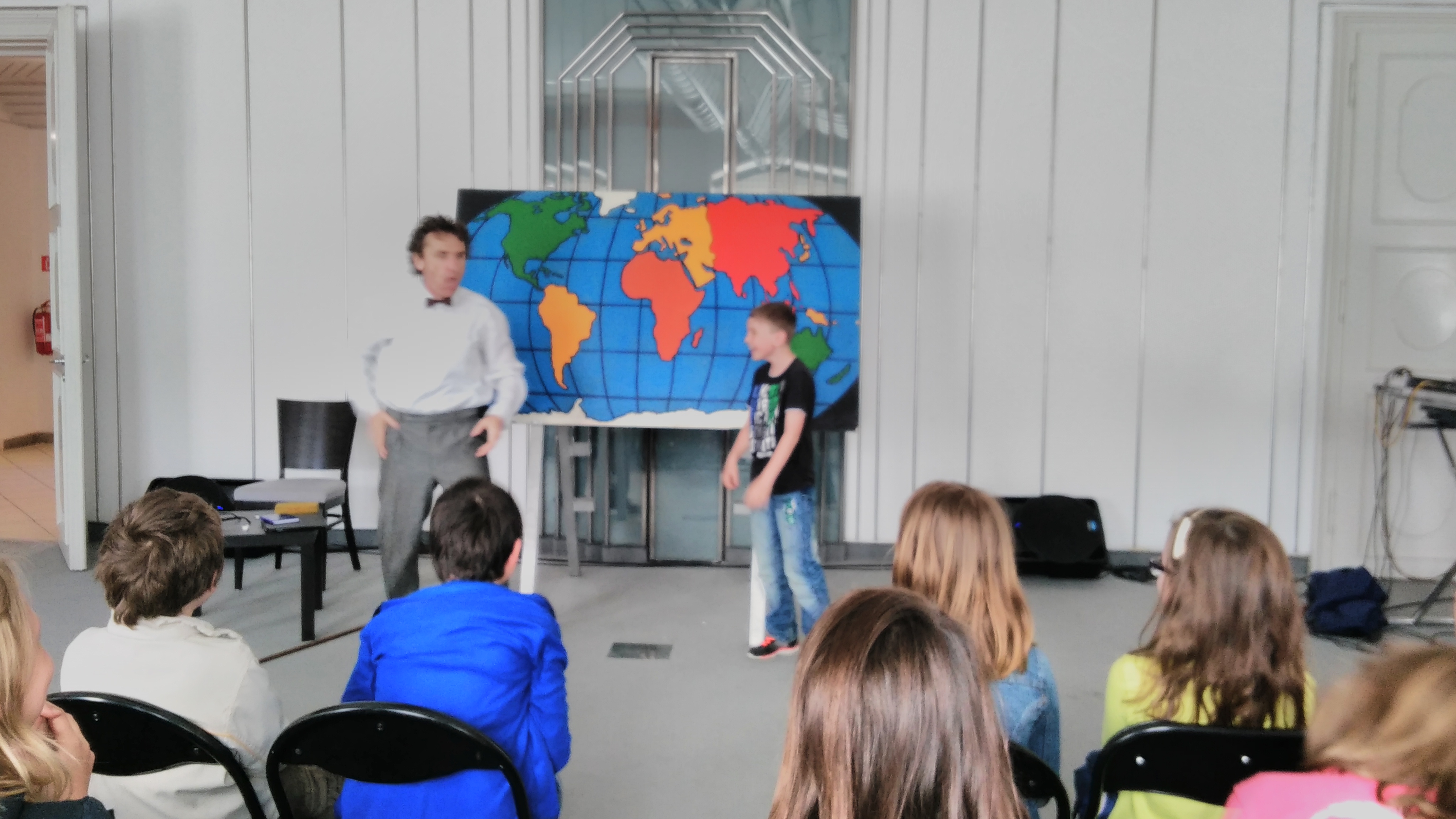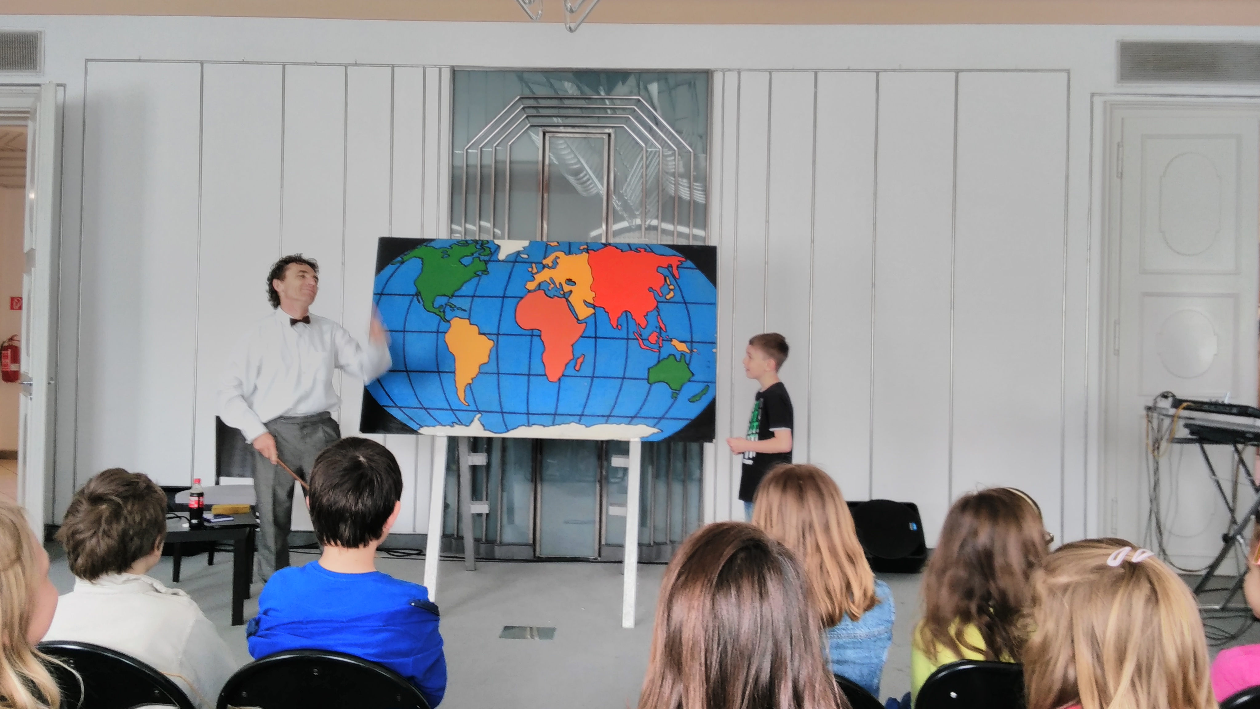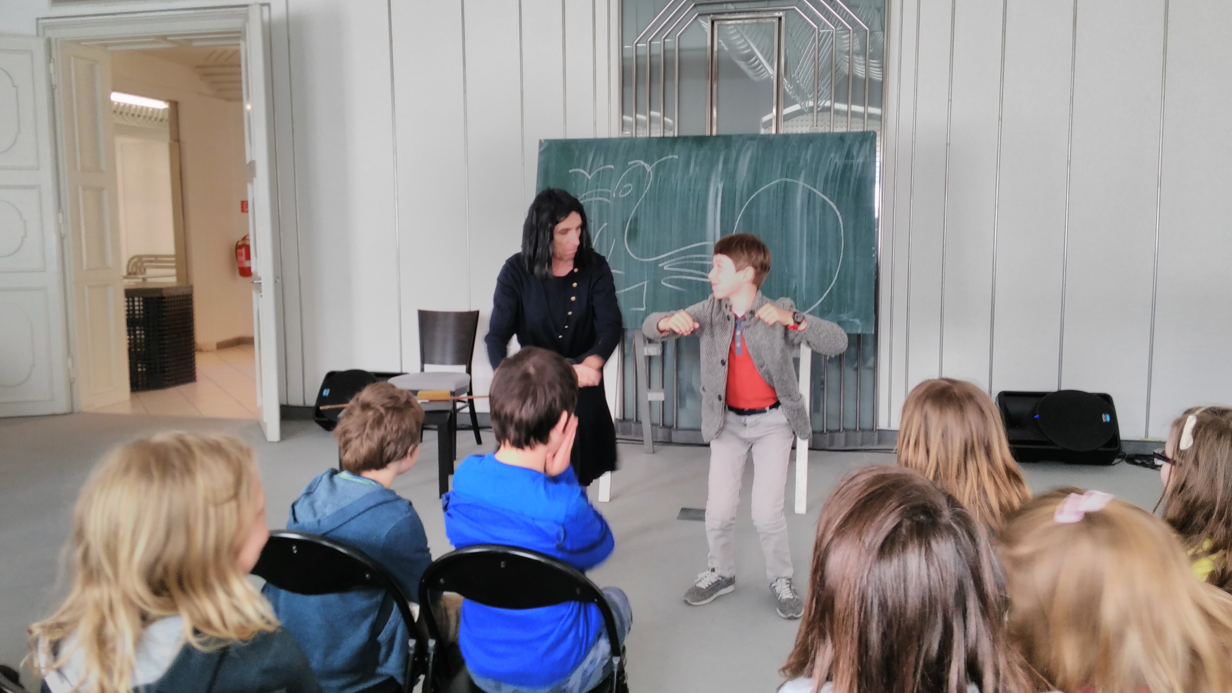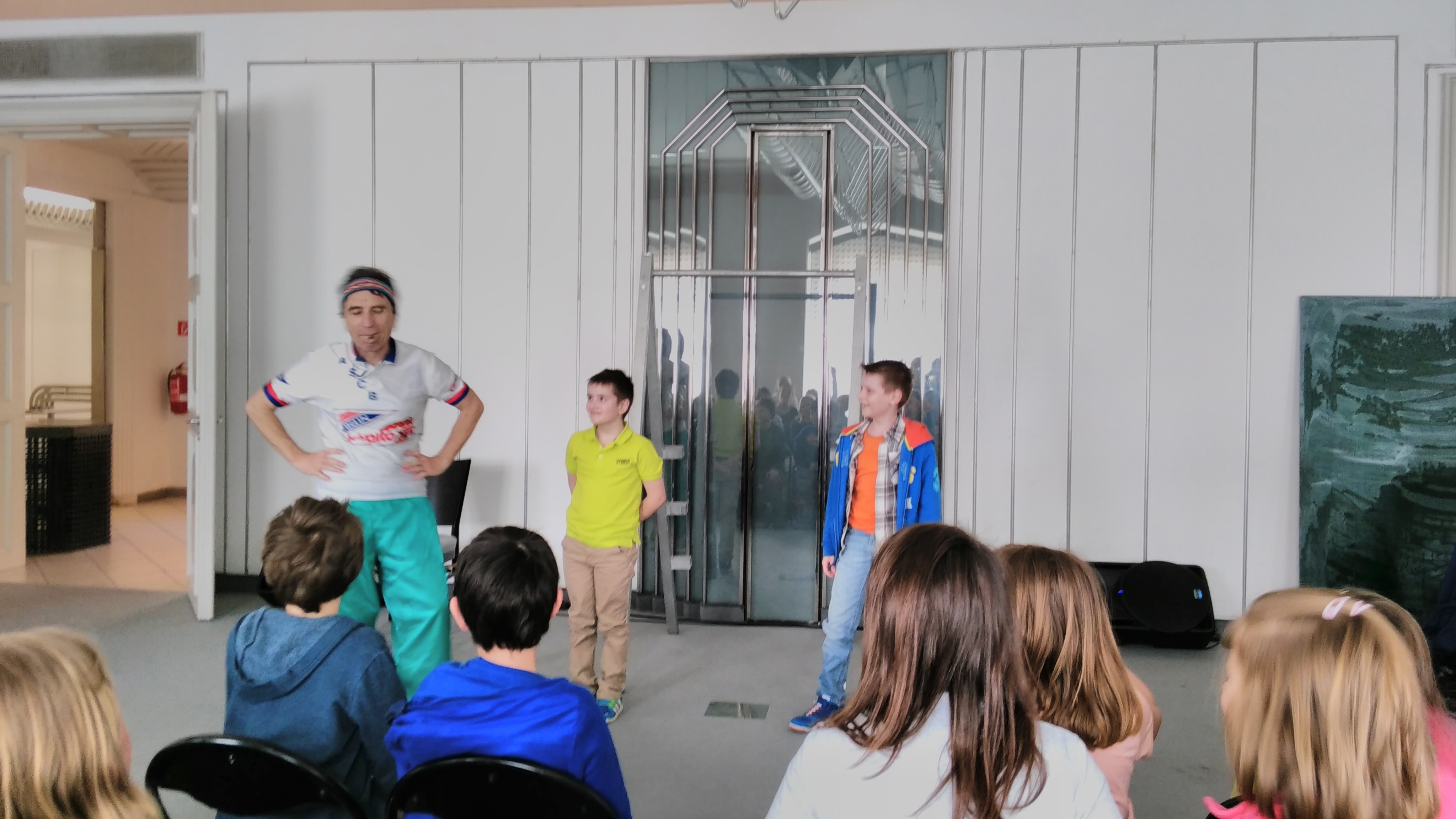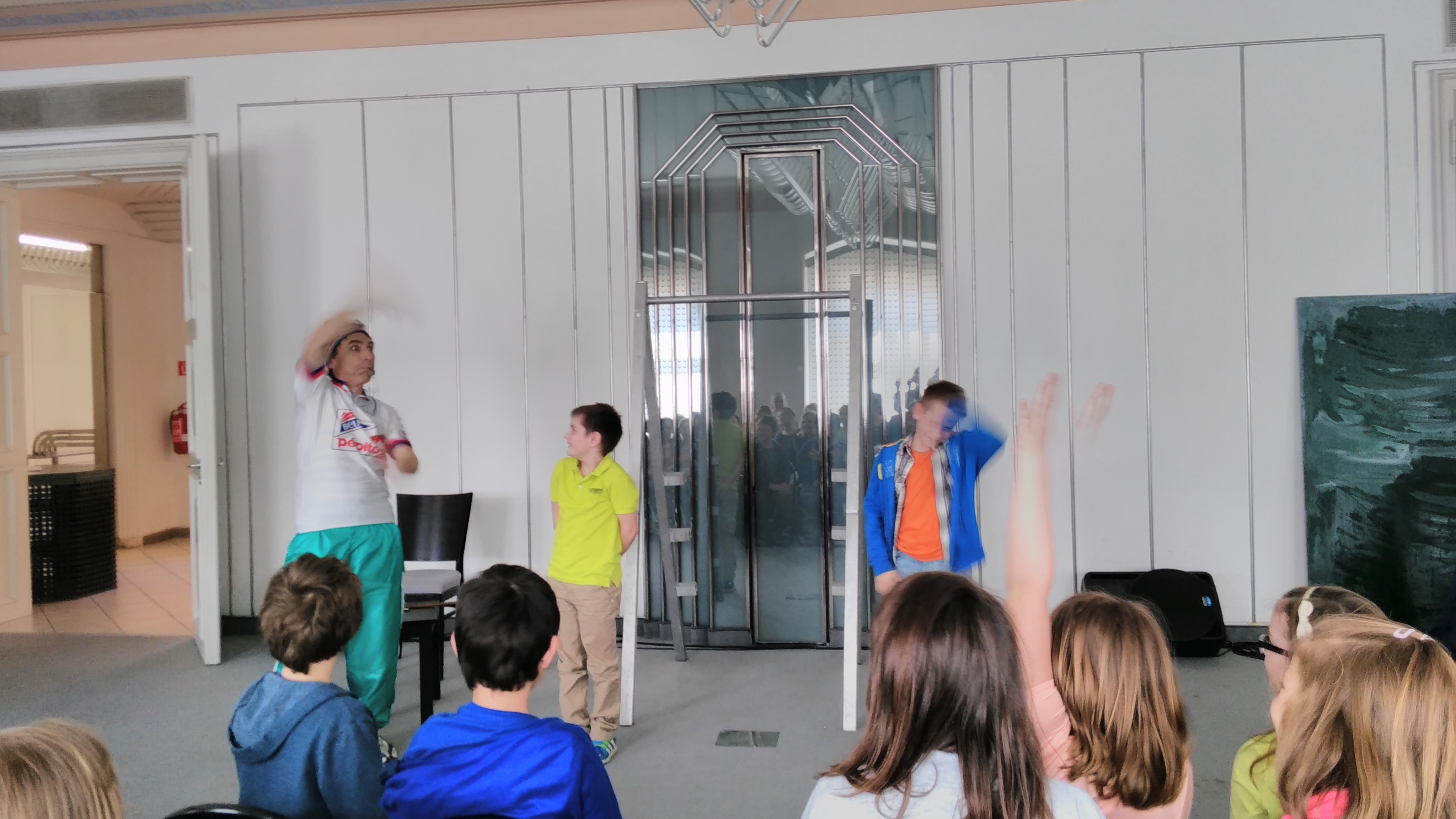 Zahrali sa na zábavnú školu, kde bol učiteľom mím. Bez toho, aby povedal čo len jedno slovko, vyučoval vlastivedu, prírodovedu, telesnú aj hudobnú výchovu. Celé vyučovanie bolo spestrené hudobným sprievodom, bola to výborná zábava.