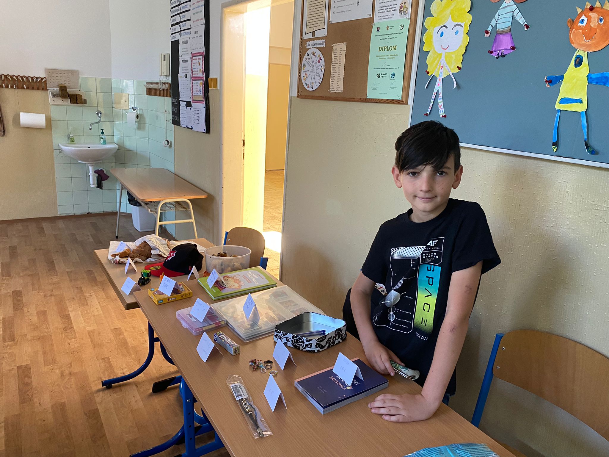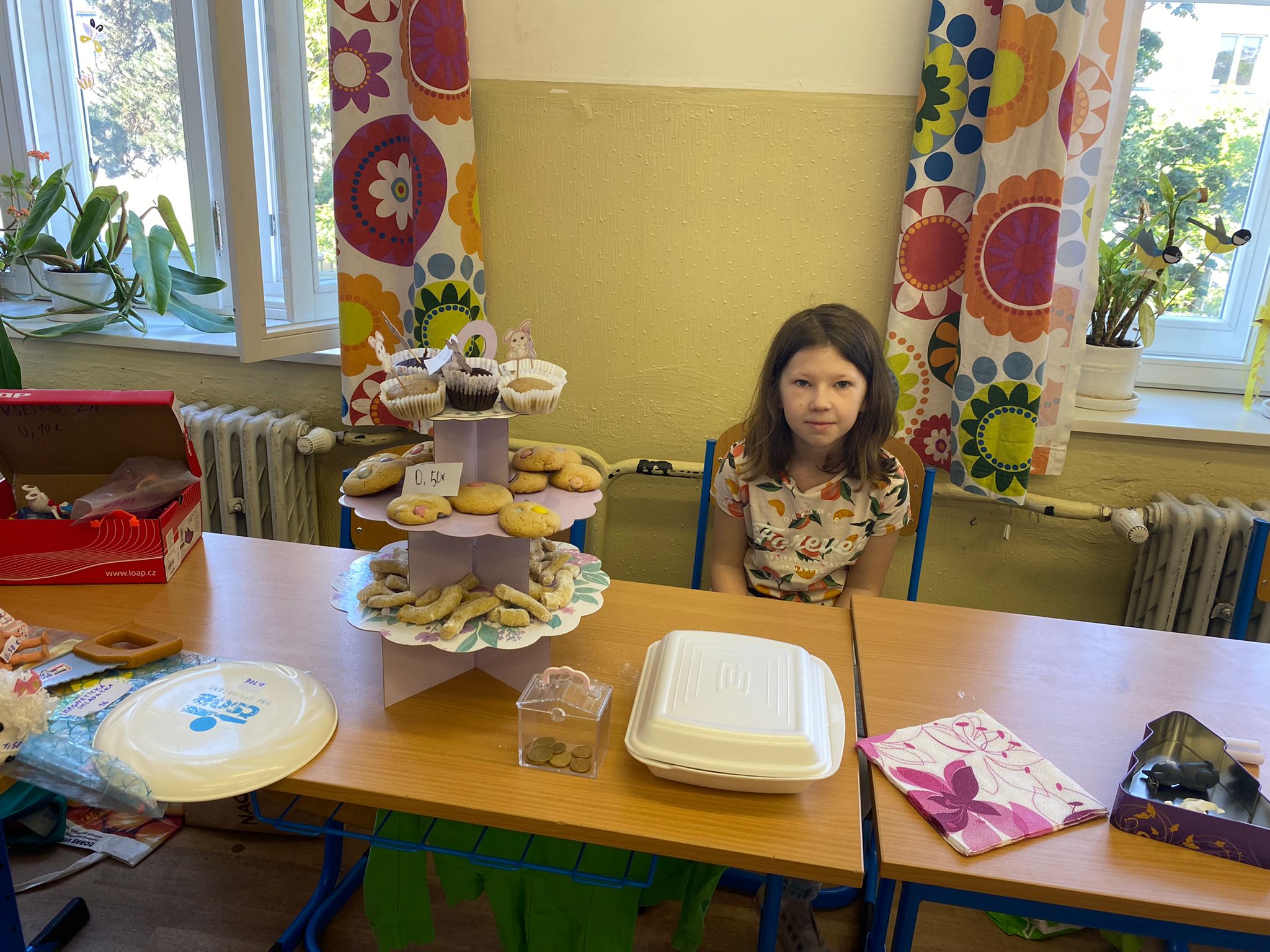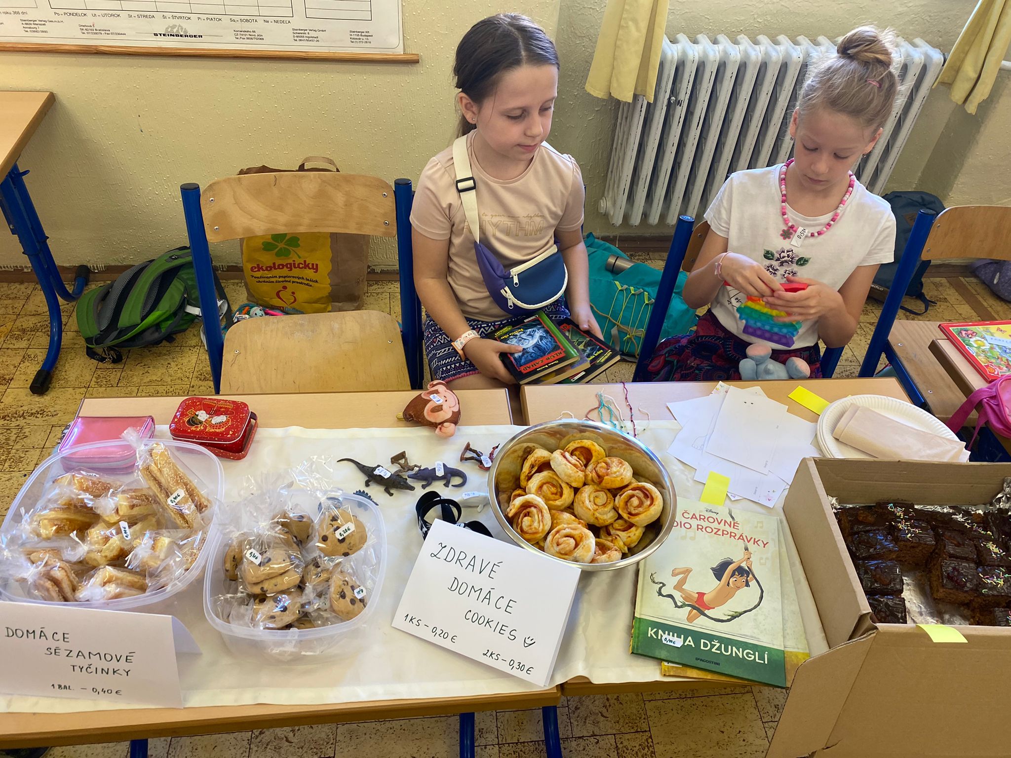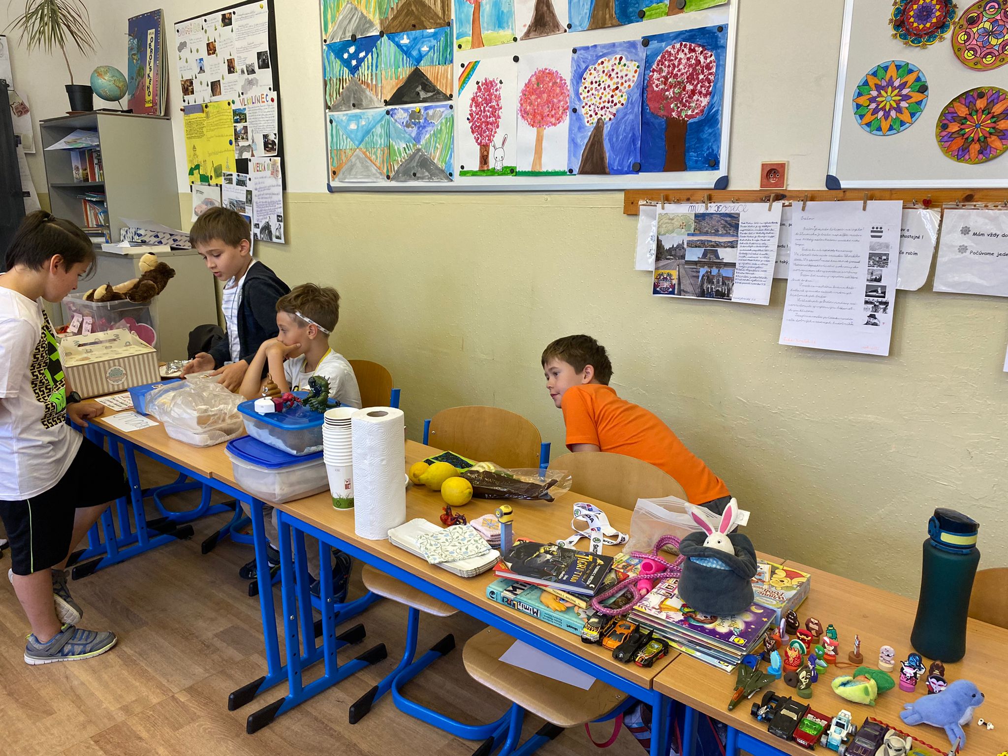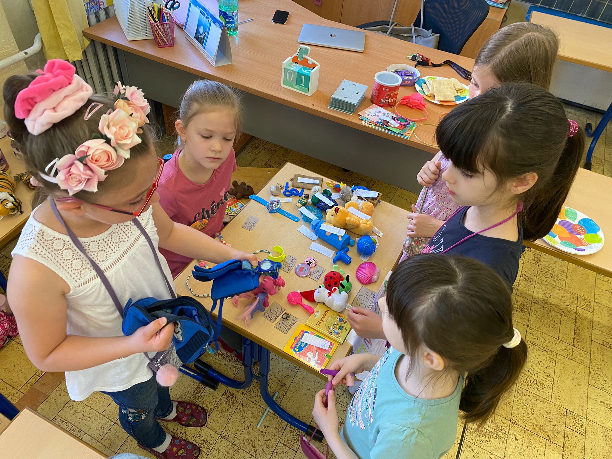 Každá trieda sa zmenila na množstvo malých zaujímavých obchodíkov. Deti okrem hračiek ponúkali na predaj za pár centov aj koláčiky a iné maškrty, ktoré poslali ich mamičky. Bzučalo to ako v úli. Každý predavač sa snažil predať čo najviac, pretože vedel, že za utŕžené peniaze urobíme radosť deťom, ktoré v tento deň nemohli byť v škole. Niektoré neboli dokonca ani doma, pretože sú vážne choré v nemocnici. Tento rok venujeme výťažok z burzy neziskovej organizácii Plamienok, ktorá pomáha nevyliečiteľne chorým deťom. My pani učiteľky sme nesmierne hrdé na všetky deti, ktoré sa tak usilovne snažili pri príprave aj realizácii tohto dňa.