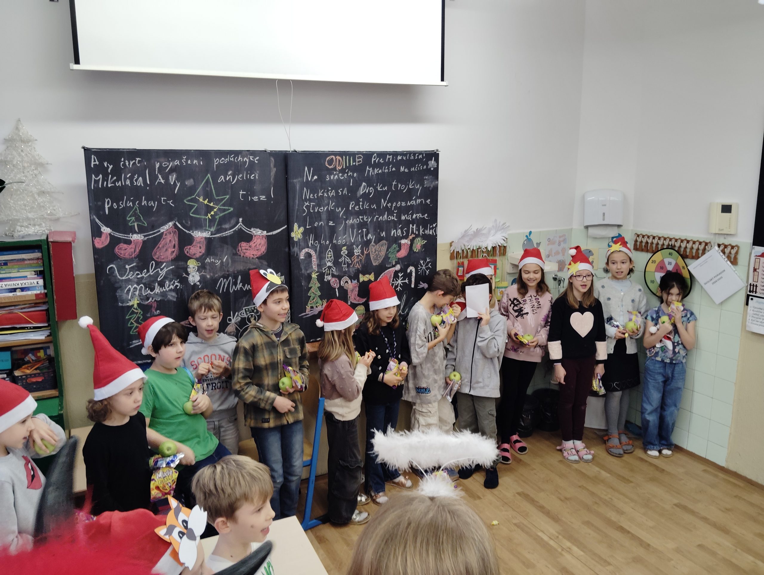 Sviatok sv. Mikuláša si už tradične pripomíname mikulášskym sprievodom, ktorý organizujú naši deviataci. Novinkou bolo milé vystúpenie našich piatakov, ktorí svojim spolužiakom zaspievali niekoľko vianočných kolied. Mikuláš spolu so skupinou anjelov a čertov navštívili všetky triedy našej základnej a materskej školy. Básničky a pesničky odmenili naši najstarší žiaci sladkou maličkosťou.
