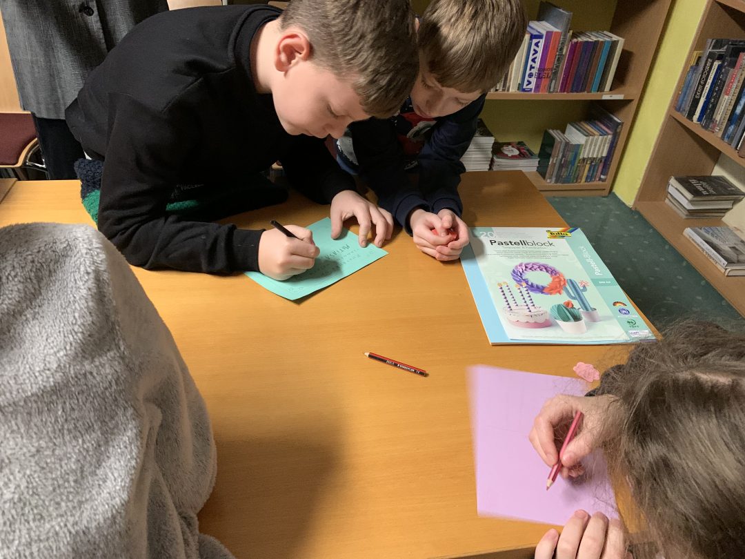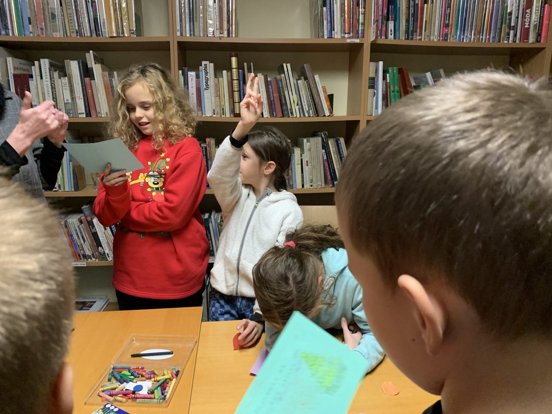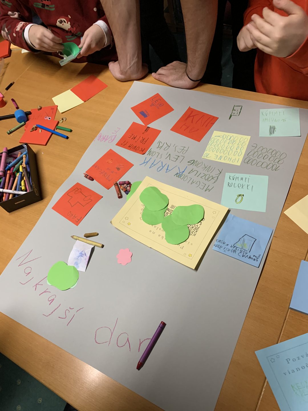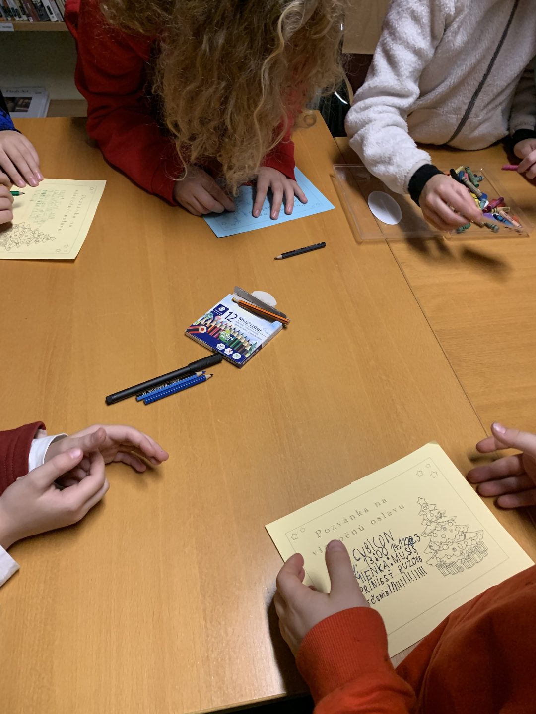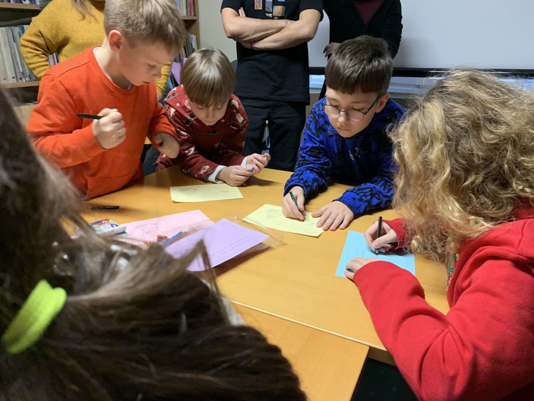 Začalo sa čítaním knižného príbehu „Musíš si priniesť klobúk“ z pera Kate Hindley a Simon Philip. Čítanie bolo sprevádzané vtipnými zvukmi a poznámkami čítajúcich, čo si deti so smiechom užili. Pokračovalo sa pexesom s rozprávkovými postavami a následne písaním vlastnej pozvánky na zábavnú vianočnú oslavu. Deti si tiež v skupinkách vyrobili plagát najúžasnejších vianočných darčekov a všetko sme to zavŕšili tančekom letkiss dance.