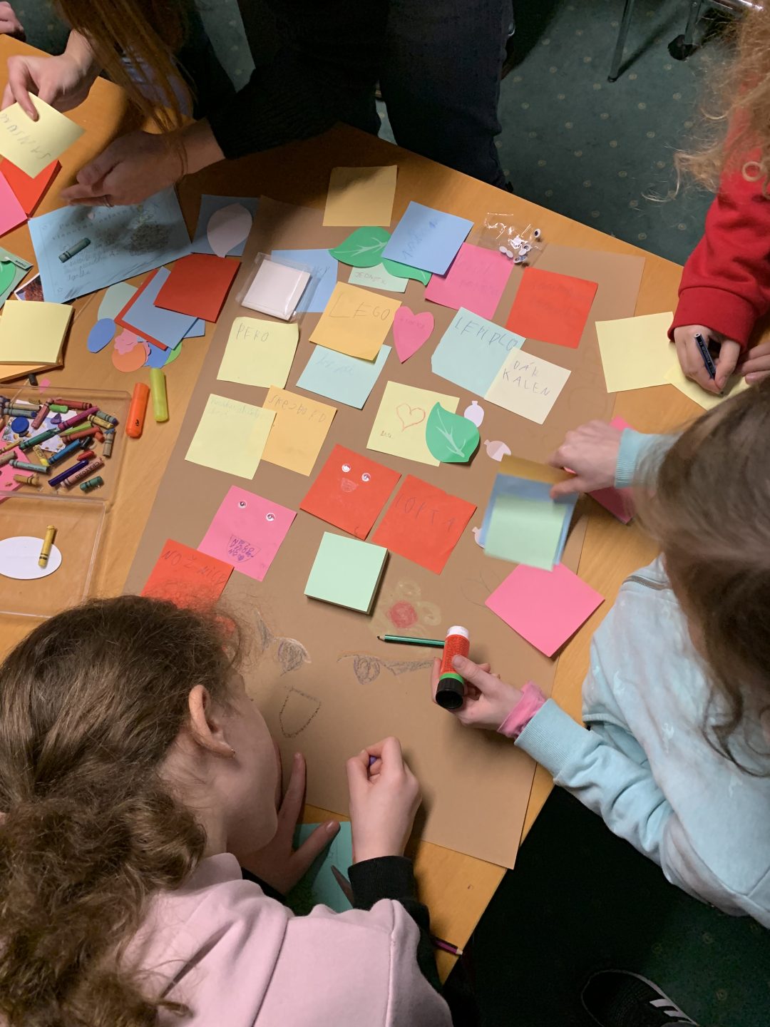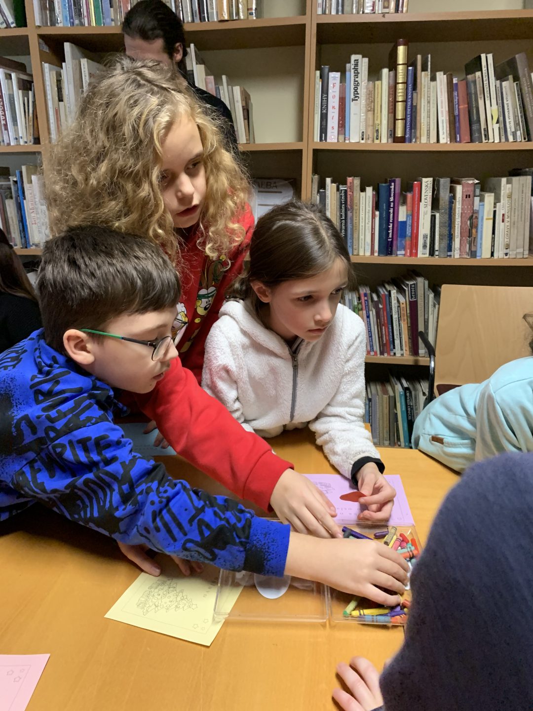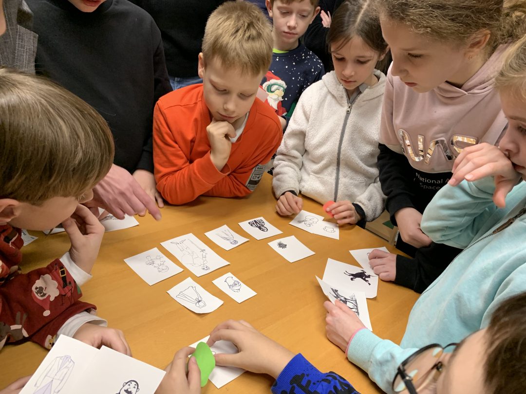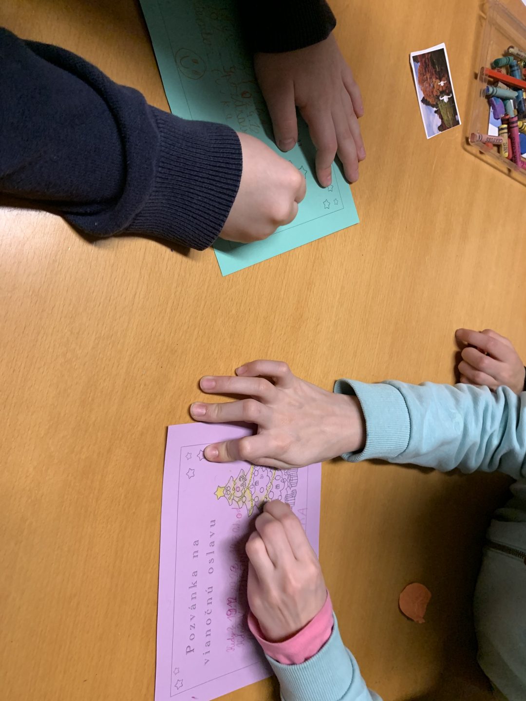 Začalo sa čítaním knižného príbehu „Musíš si priniesť klobúk“ z pera Kate Hindley a Simon Philip. Čítanie bolo sprevádzané vtipnými zvukmi a poznámkami čítajúcich, čo si deti so smiechom užili. Pokračovalo sa pexesom s rozprávkovými postavami a následne písaním vlastnej pozvánky na zábavnú vianočnú oslavu. Deti si tiež v skupinkách vyrobili plagát najúžasnejších vianočných darčekov a všetko sme to zavŕšili tančekom letkiss dance.