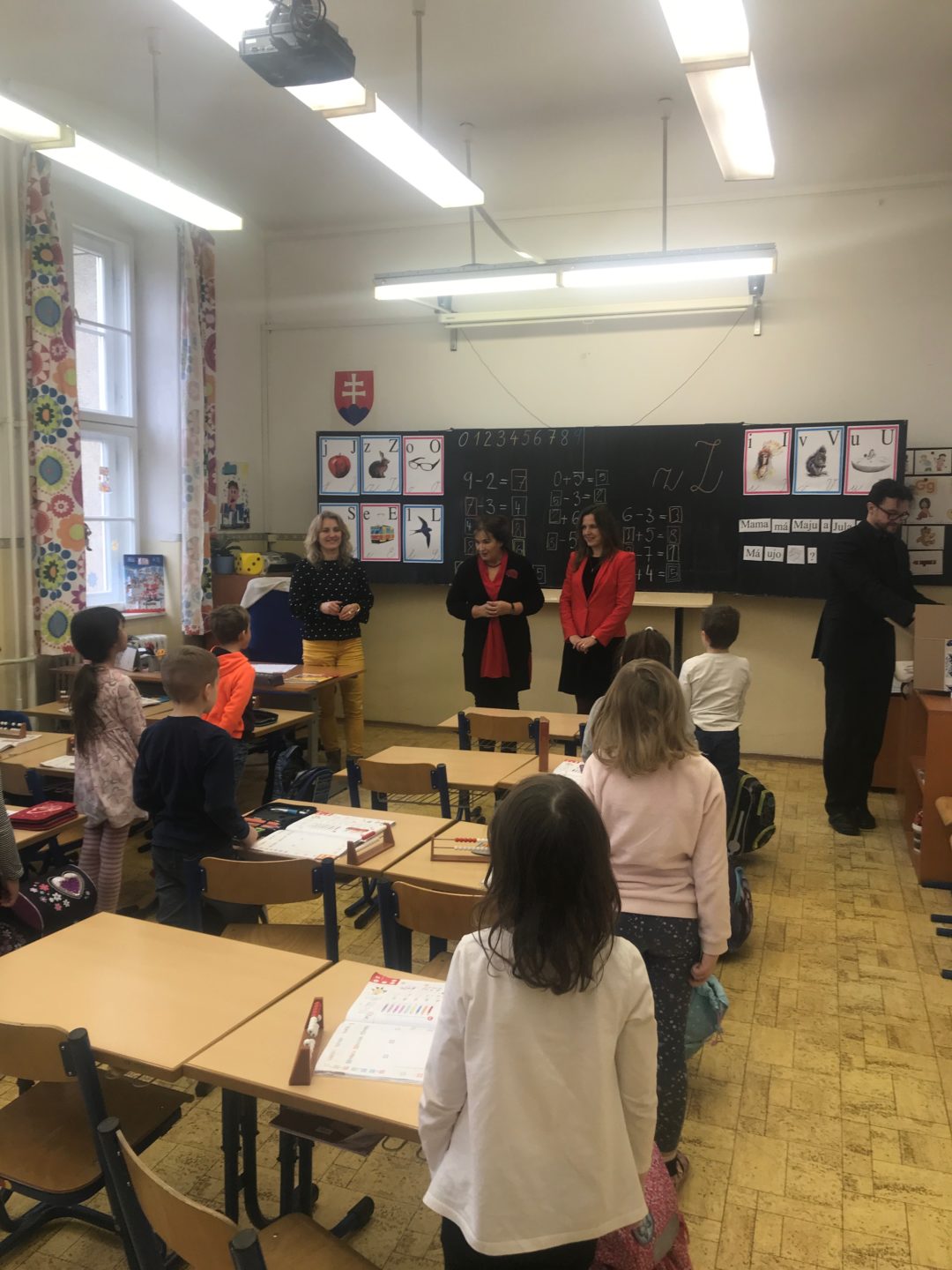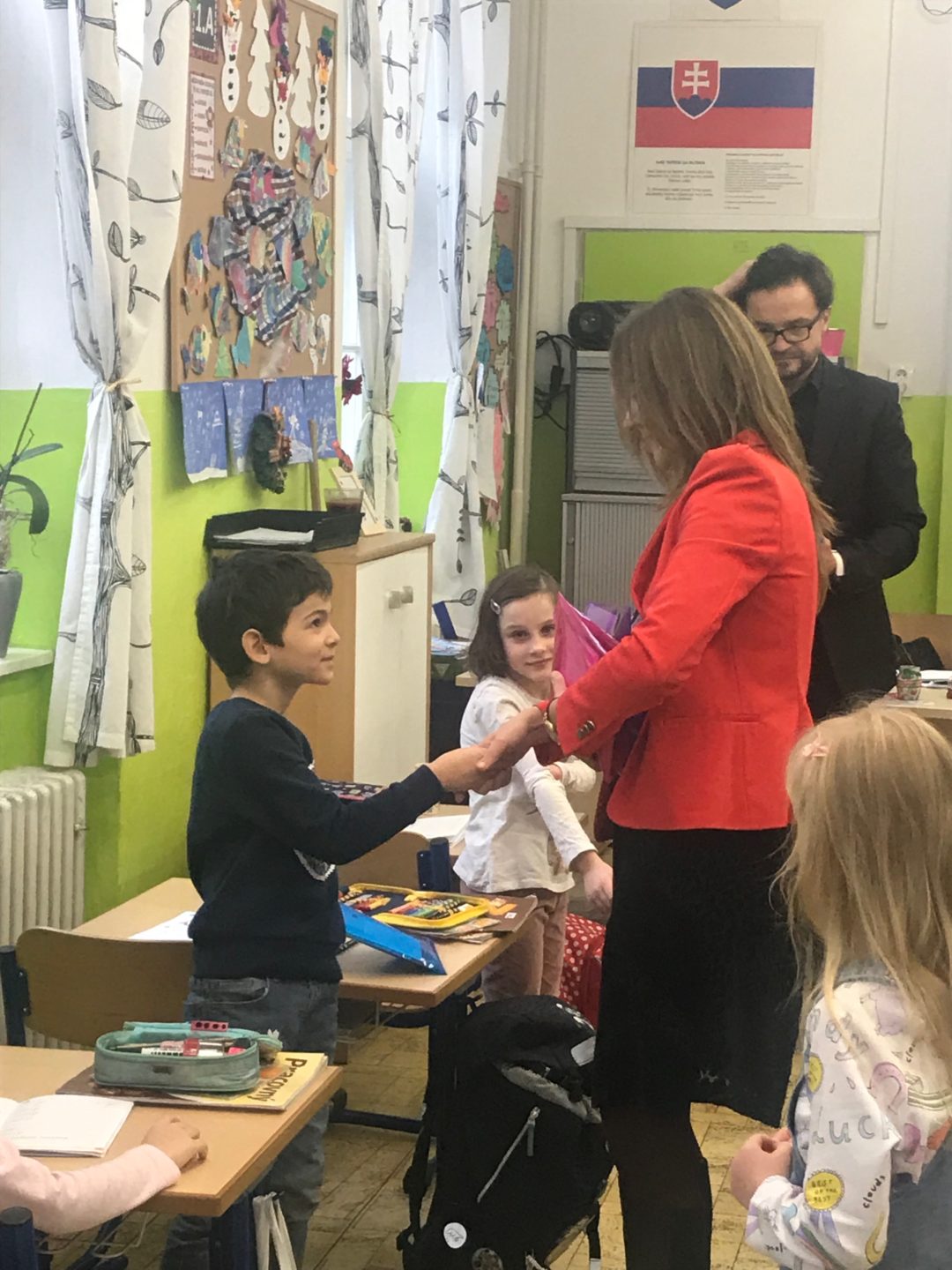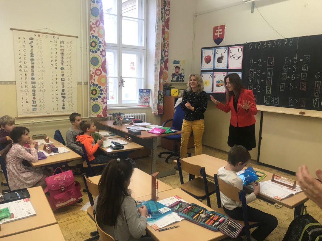 Ing. arch. Zuzana Aufrichtová, starostka mestskej časti Bratislava-Staré Mesto navštívila žiakov prvého ročníka, aby ich pozdravila a porozprávala sa s nimi o tom, ako sa im darí. Priniesla každému hodnotný darček v podobe školských potrieb. Deti mali veľkú radosť a okrem poďakovania predviedli, čo sa už v škole naučili. Zaspievali pesničky, zarecitovali básničky a pochválili sa svojimi písankami. Okrem toho pani starostka odovzdala pani riaditeľke Mgr. Etele Hessovej ešte jeden darček, tentokrát pre všetkých žiakov, projektor a plátno.