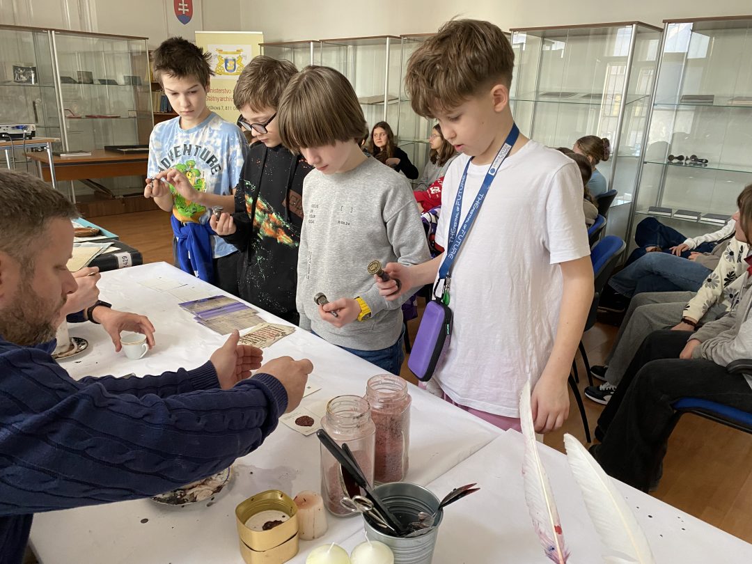 Piataci mali možnosť zoznámiť sa s rôznymi písacími látkami, spôsobom uchovávania a spracovávania archívnych dokumentov.