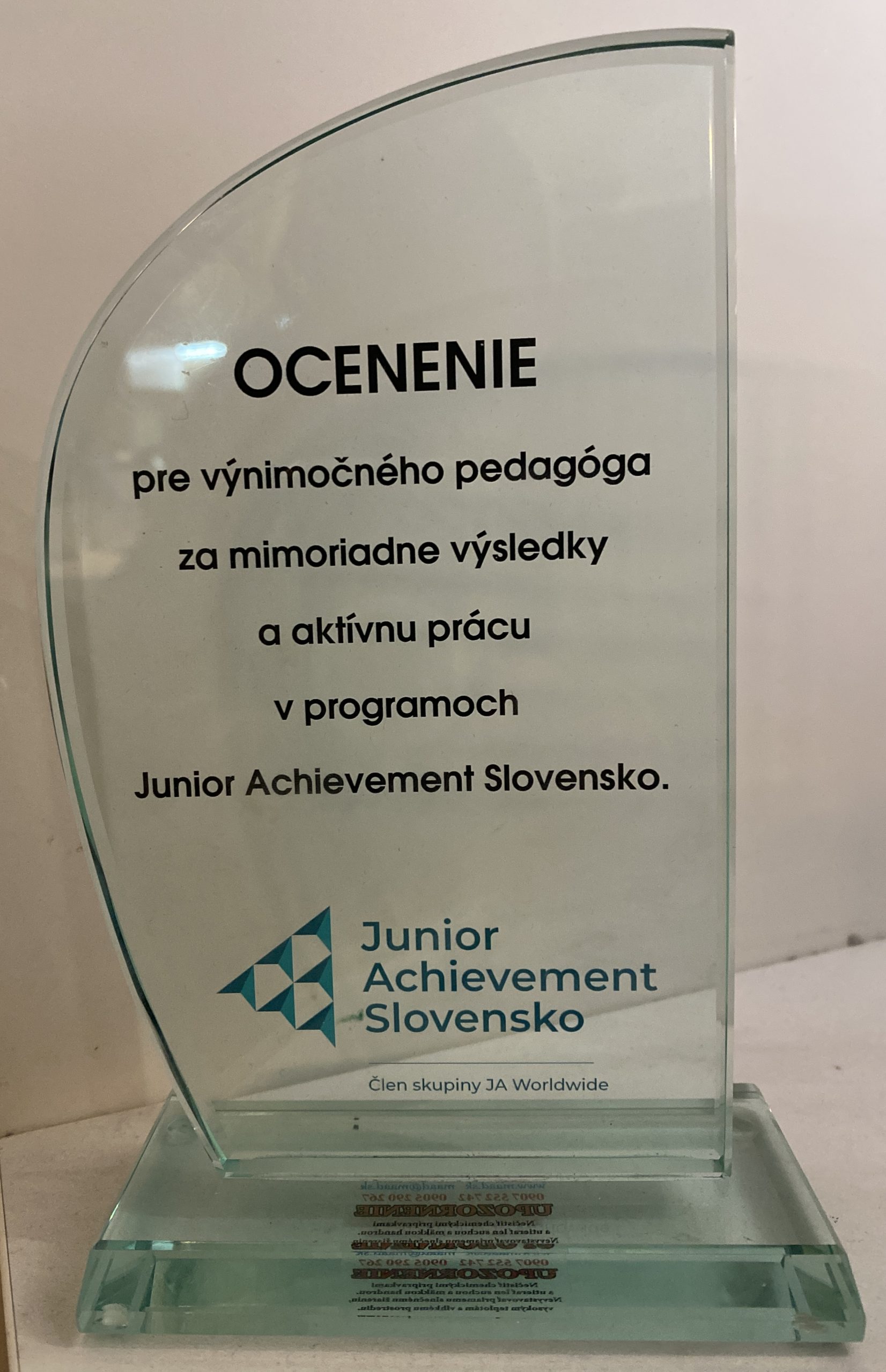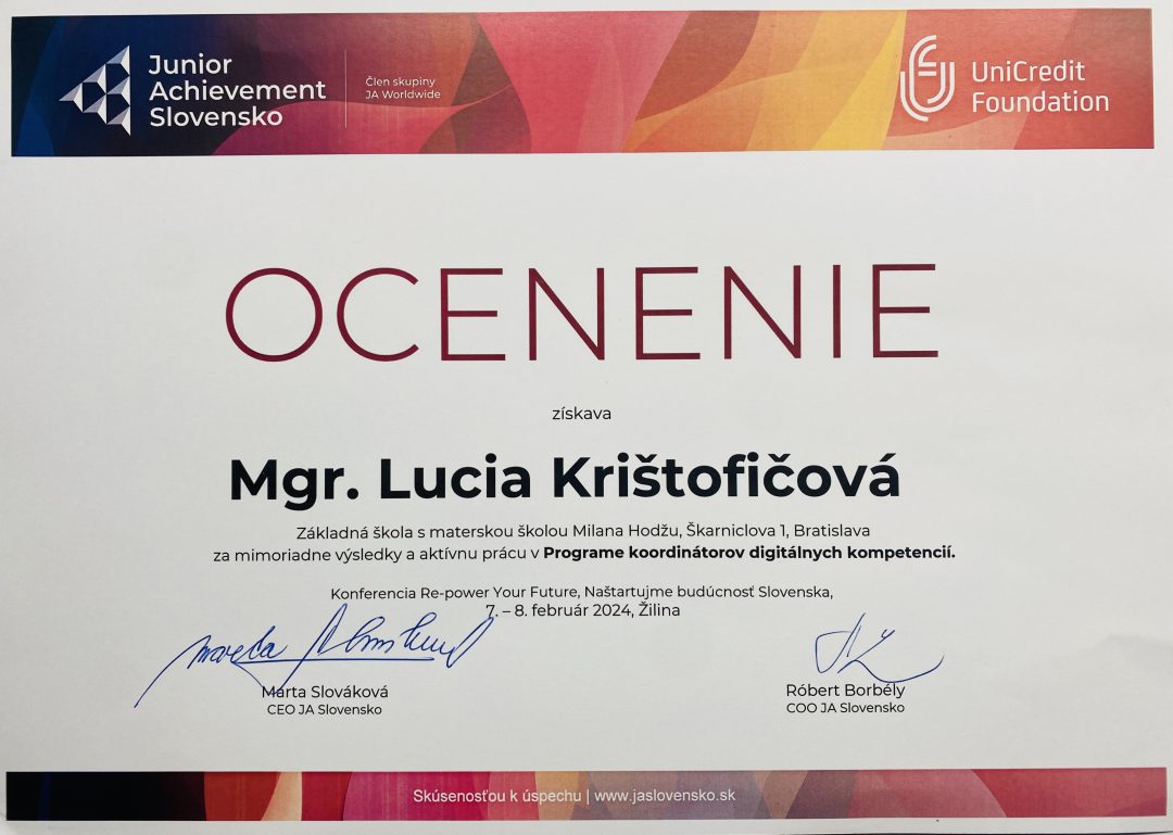 Na základe doterajšej kvalitnej spolupráce sa v tomto školskom roku rozhodla nezisková vzdelávacia organizácia Junior Achievment (JA) Slovensko udeliť špeciálne ocenenie za dlhoročnú, profesionálnu a inovatívnu prácu v Programe koordinátorov digitálnych kompetencií našej pani učiteľke Lucii Krištofičovej. Jej angažovanosť, skúsenosti a výsledky sú dokazom úspechu celého programu.