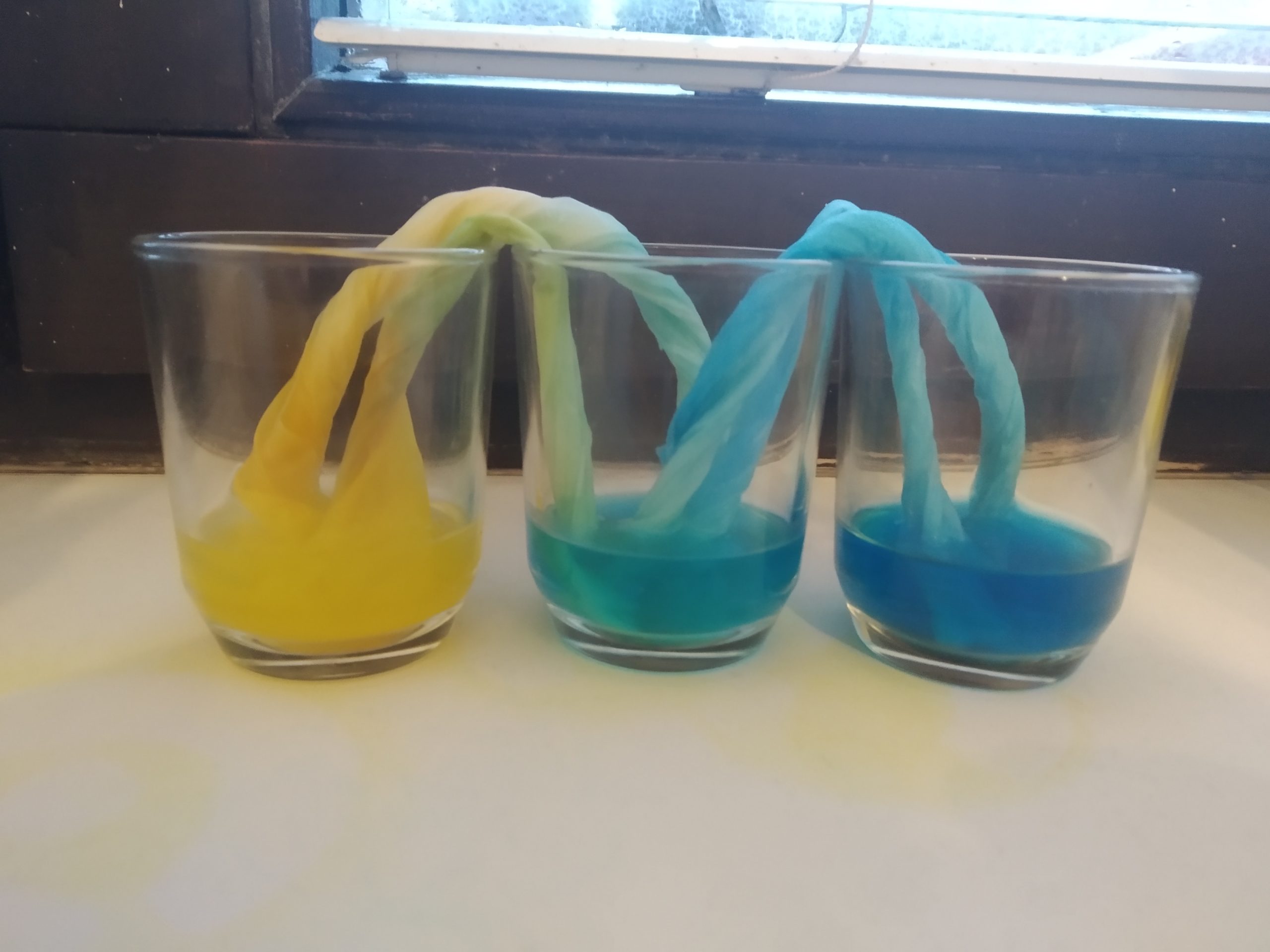 Potrebujete tri poháre, vodu, potravinárske farbivo a dve servítky. Poháre postavíme vedľa seba. Do krajných pohárikov nalejeme vodu a zafarbíme ju farbivom. Stočíme papierové vreckovky a vložíme ich do pohárov. Voda z krajných pohárikov sa bude sťahovať po servítke do stredného pohára a farba vody sa zmení.