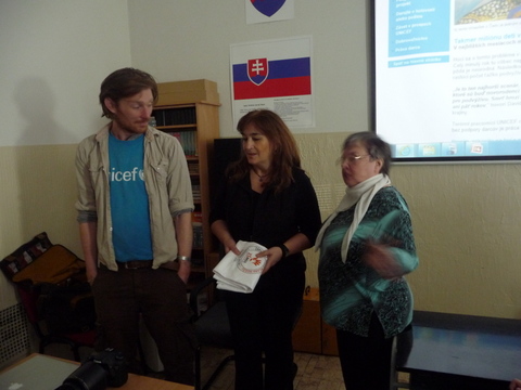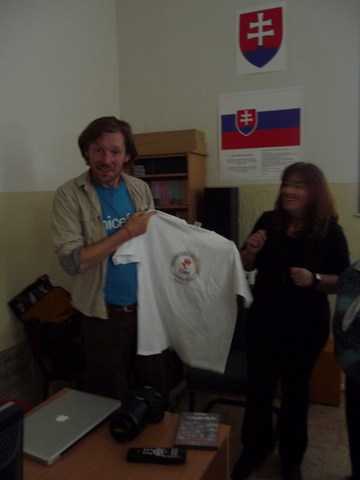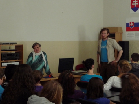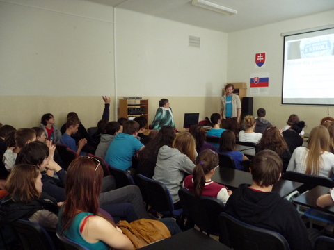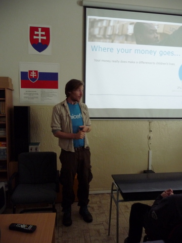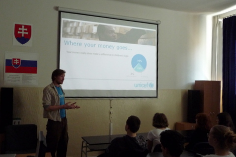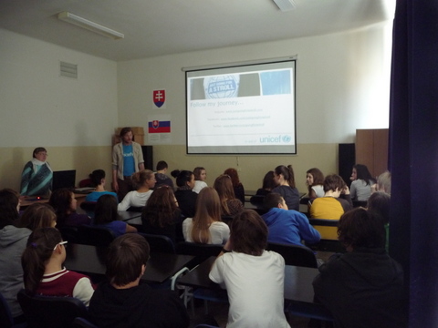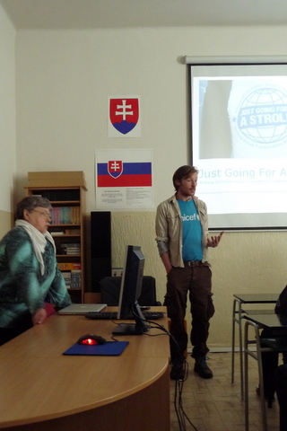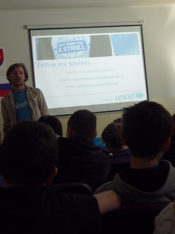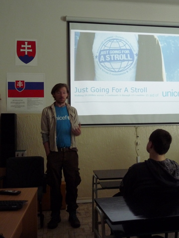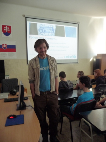 Žiaci našej školy mali jedinečnú možnosť osobne sa stretnúť s mužom, ktorý je, ako on hovorí, „ iba na prechádzke“ okolo sveta. Na svojej ceste navštevuje, okrem iného, aj rôzne inštitúcie  a v piatok 20. apríla 2012 sa zastavil u nás. Najprv nám prostredníctvom prezentácie predstavil aktivity organizácie UNICEF. Potom nasledovala voľná diskusia. Samozrejme, James Thomas rozprával po anglicky. Tí odvážnejší z nás kládli otázky tiež v angličtine. Ale vďaka pani učiteľke Holičovej, ktorá bola vynikajúci tlmočník, sa mohli spýtať a porozumieť odpovediam aj tí, ktorí si svojou angličtinou neboli istí. Počas debaty sme sa dozvedeli, že James ovláda aj mnoho iných jazykov, napr. španielčinu a nemčinu. Vysvetlil nám, že on priamo nepracuje pre UNICEF, ale je iba dobrovoľníkom. Od organizácie teda nedostáva plat, pretože nie je priamym zamestnancom. Taktiež sme sa dozvedeli, odkiaľ získal peniaze na cestu alebo prečo si za cieľ zvolil práve Nový Zéland a mesto Dunedin. Na naše otázky odpovedal naozaj veľmi ochotne. Ja som sa ho spýtala, či sa mu jeho život nebude zdať obyčajný, keď sa vráti naspäť do Írska. Povedal, že nie,  pretože toto nie je jeho posledná cesta. Jeho ďalším snom je prejsť na koni cez Európu až do Thajska, Mongolska a Číny. Ďalej na Aljašku a krížom cez Ameriku. Prezradil nám aj, že ďalej by chcel prejsť džípom cez Afriku. Podľa mňa je to odvážny a statočný človek, ktorý sa pokúša zmeniť svet k lepšiemu. Myslím si, že príležitosť stretnúť sa s takýmto človekom sa málokomu z nás naskytne ešte raz.