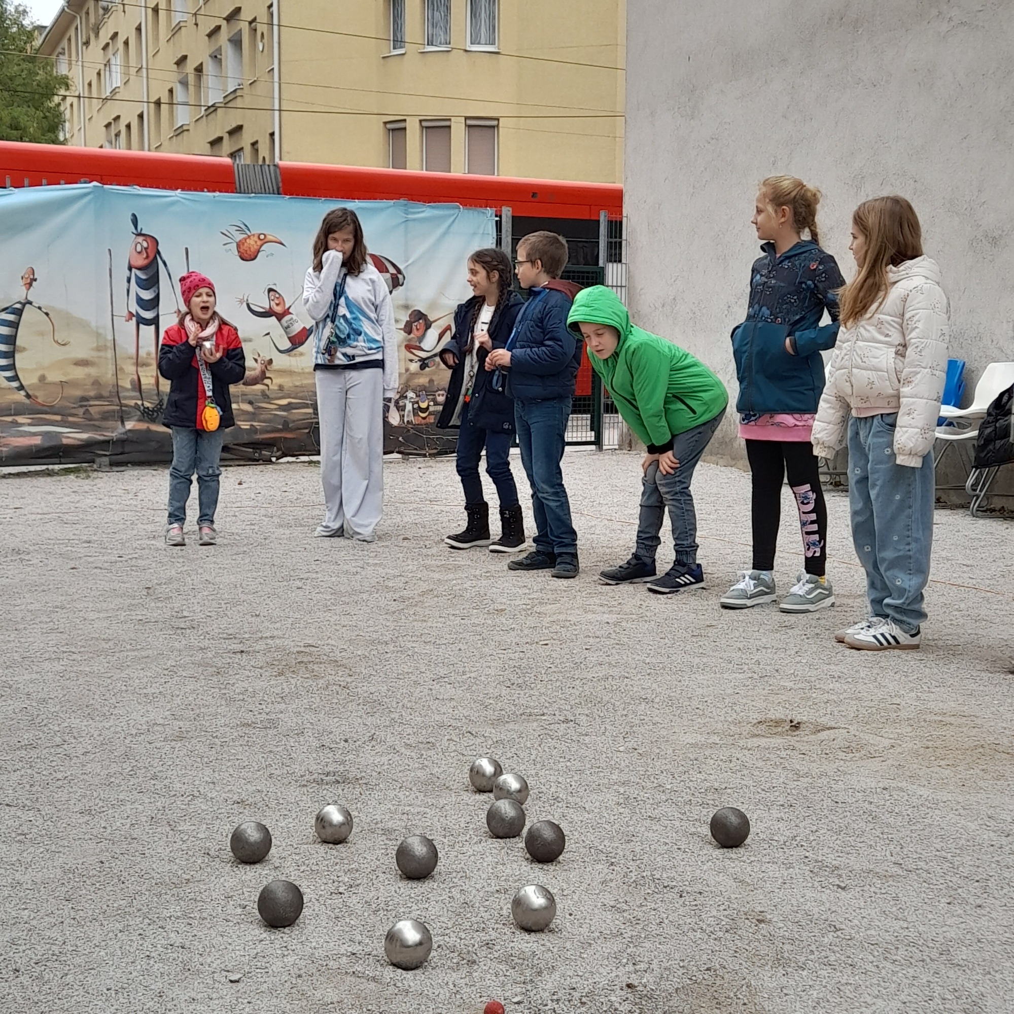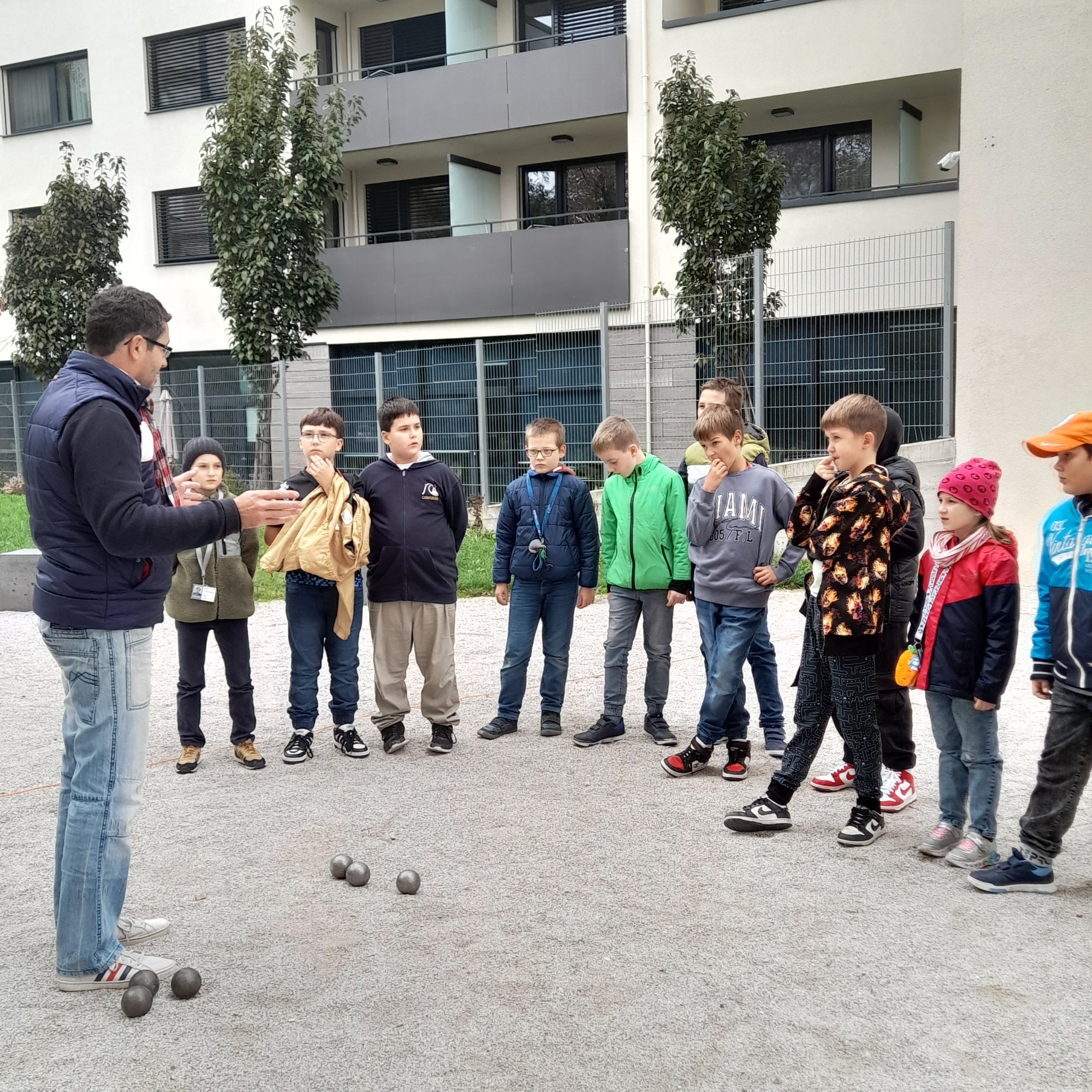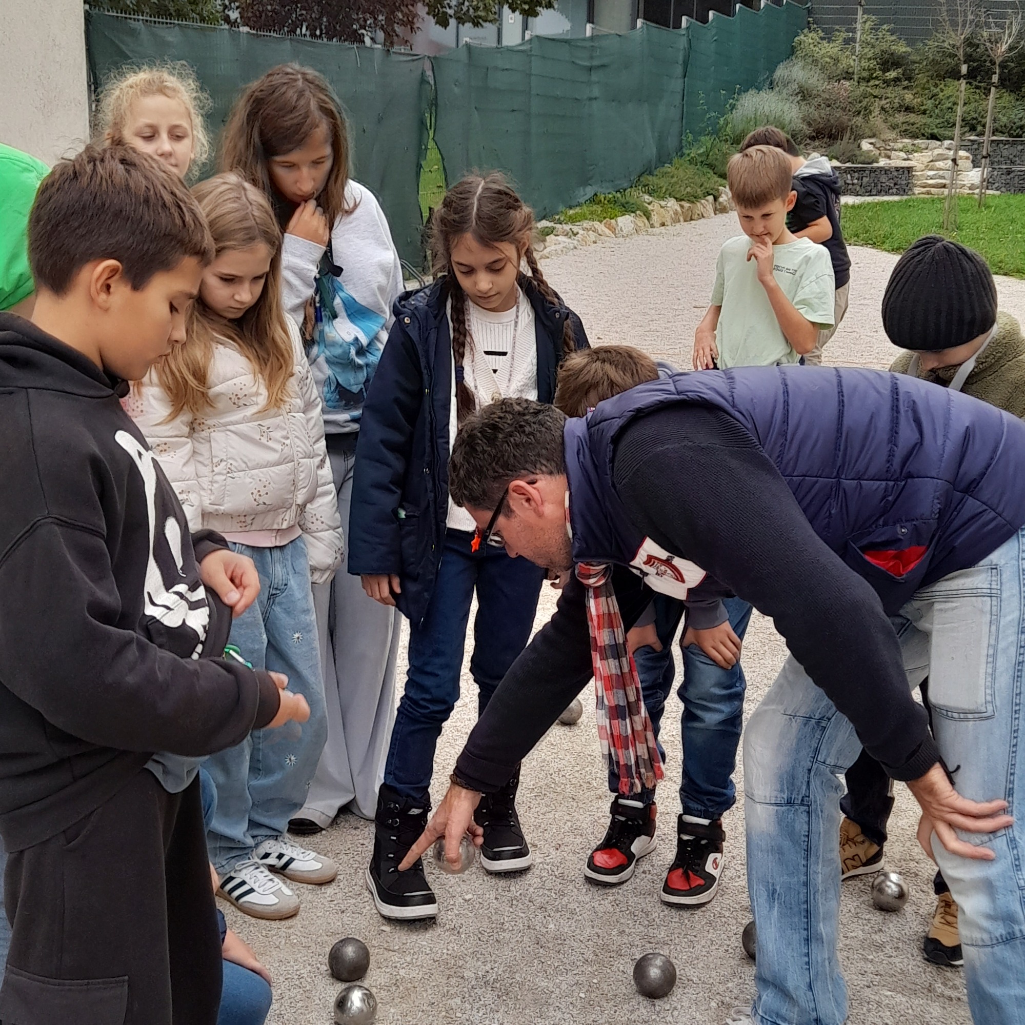 Pri opätovnej návšteve Komunitnej záhrady vymenili štvrtáci čítanie za šport. Do tajomstiev petangu ich zasvätil majster Slovenska Dušan Lančarič.